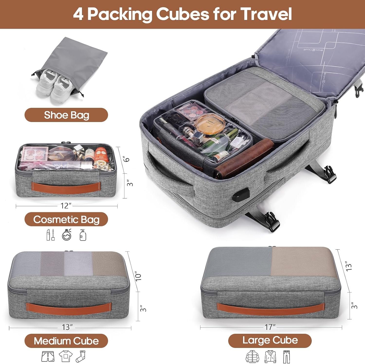3 Packing Cubes + 1 Shoe Pocket-Comes with a large cube for clothing, a medium one for shirts, and a small transparent cube for toiletries. A dedicated shoe pocket helps keep your bag organized. Built-in USB port for convenient phone charging (power bank not included).