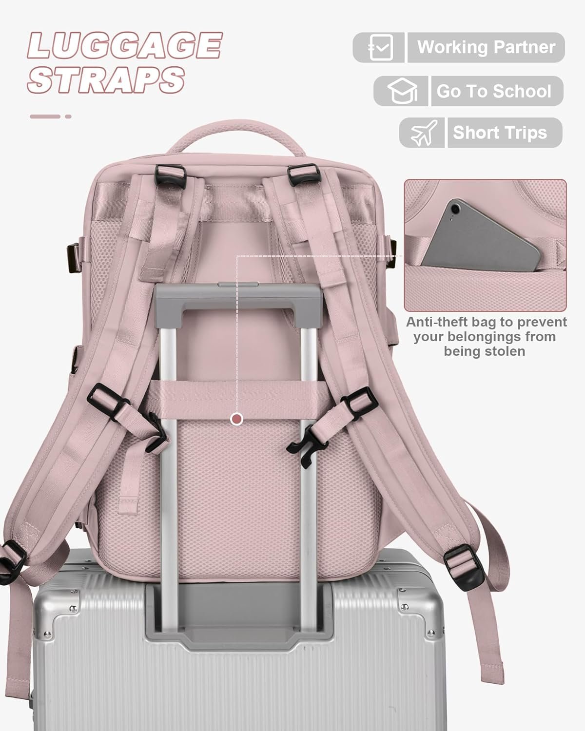 【Travel Must Haves】This travel bag has a clothing compartment that can hold the clothes you need for a weekend trip. It can also be used as a work backpack to hold items needed for office work. As a travel essentials, this backpack has luggage trolley straps on the back so you can attach the backpack to your luggage trolley to make your trip easier. The back of the backpack has a chest buckle in addition to the foam padding that will slow down your stress while traveling.