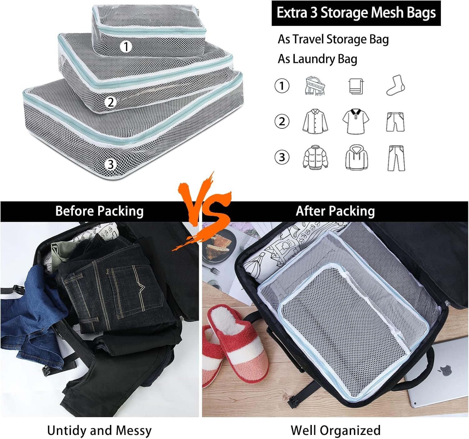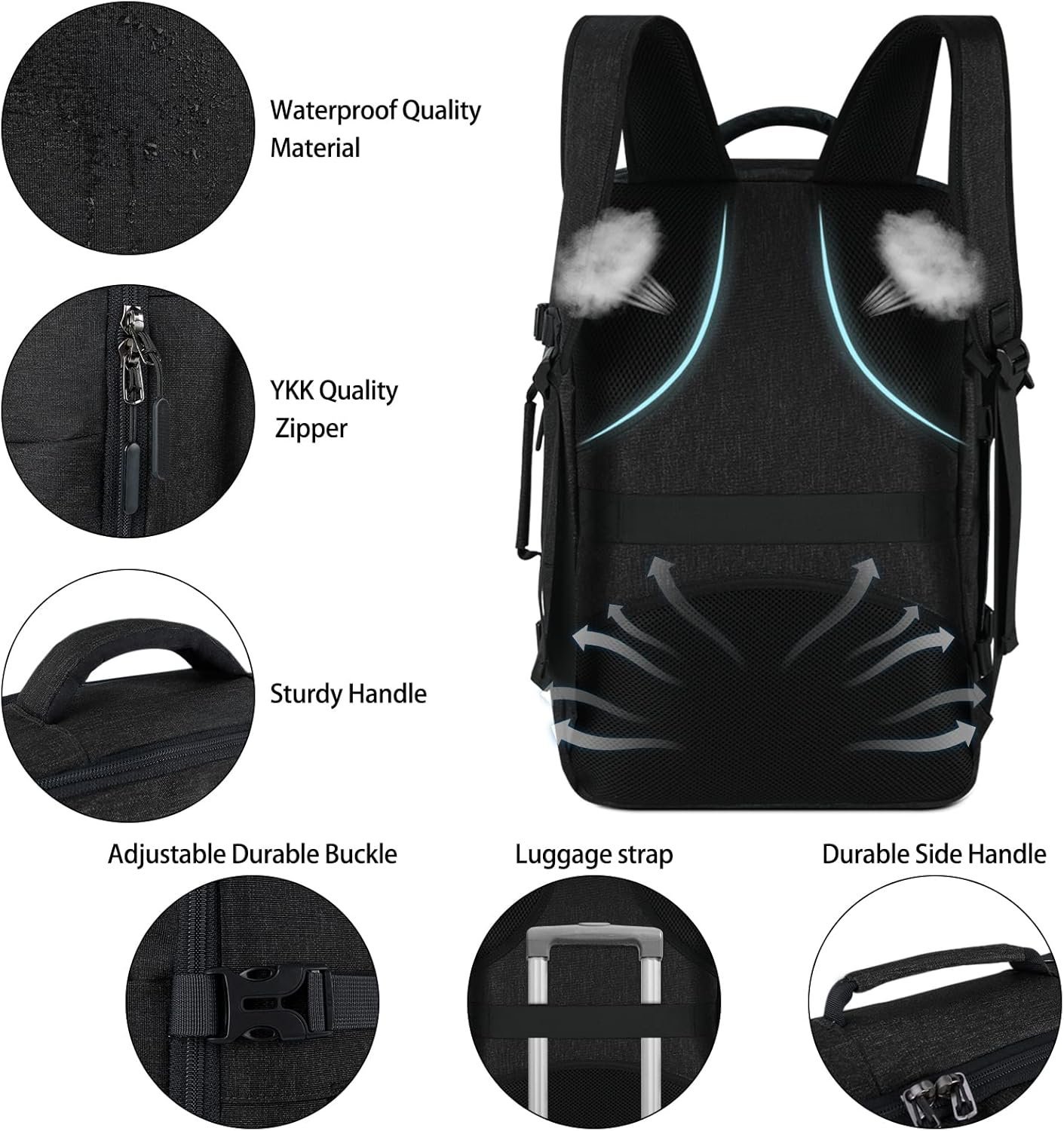 【With 3 Storage Bags & Wet Pocket】: The carry on backpack comes with extra 3 storage bags that are great for organizing your clothes when packing for a trip. Full mesh design for clearly seeing items and easier to find them. It also can be as a laundry bag to protect your clothes from tangling. The travel backpack is equipped with a front wet pocket that is made of high-density waterproof material. It is large enough to store wet clothes or toiletries.