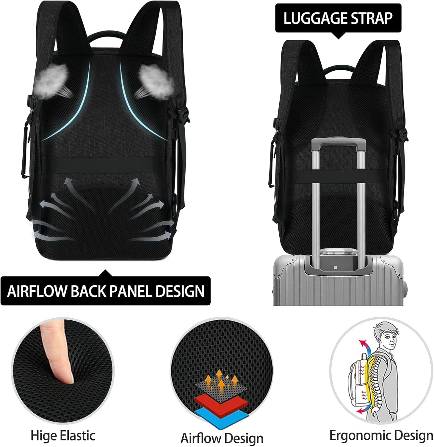 【Flight Approved Carry on Backpack】: Size of travel backpack: 20.47*13.38*7.87 inches. Capacity: 40L. This luggage backpack is meet the allowed maximum size of most IATA flights and also fits in the overhead compartment and the underseat in flight. The portable opening facilitates you to quickly pass the airport security check. It also has built-in elastic bands to keep your clothes from falling out. This travel backpack is great for flight travel, camping, hiking, college, etc.