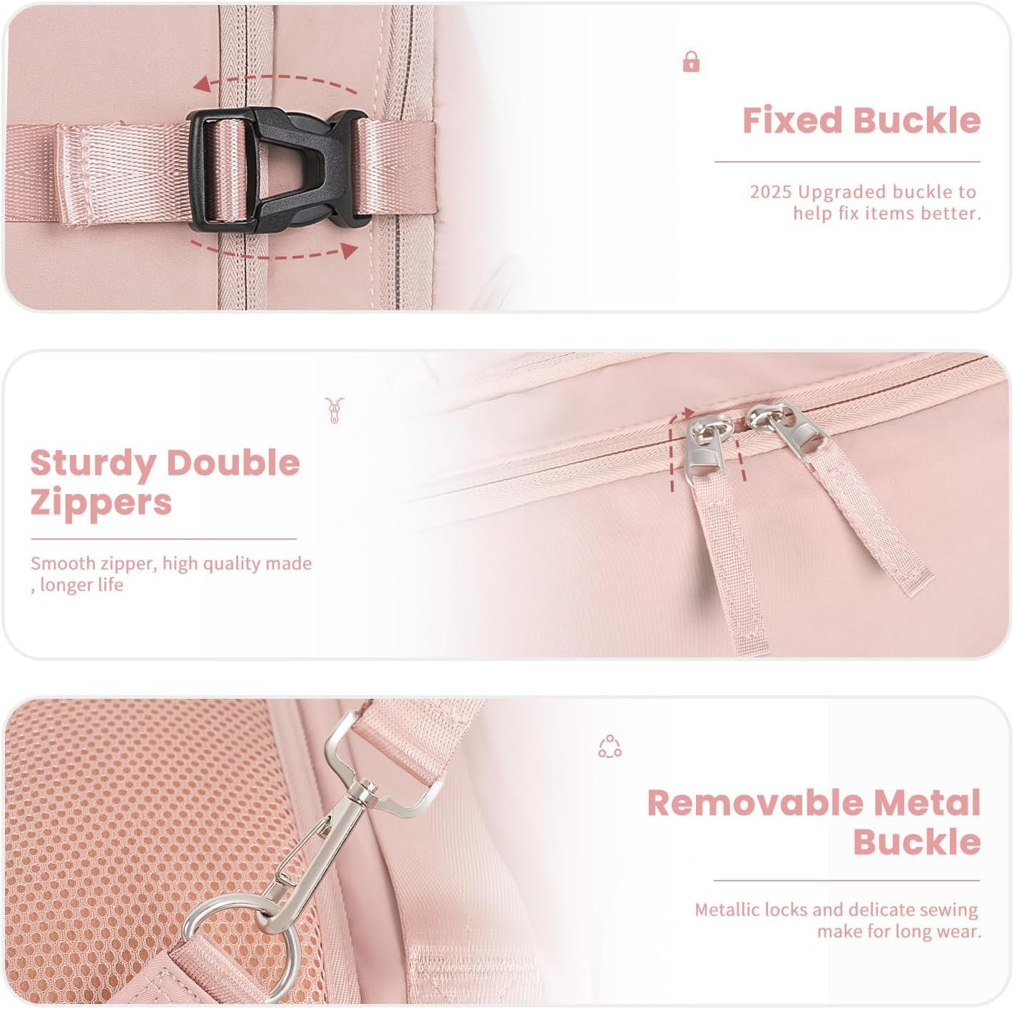 Easier Packing: Features with 180 degree opening and enough depth of the interior space, this traveling backpack enables you to pack it almost like a suitcase. And the side buckles will be helpful to compress the backpack when you overpack it