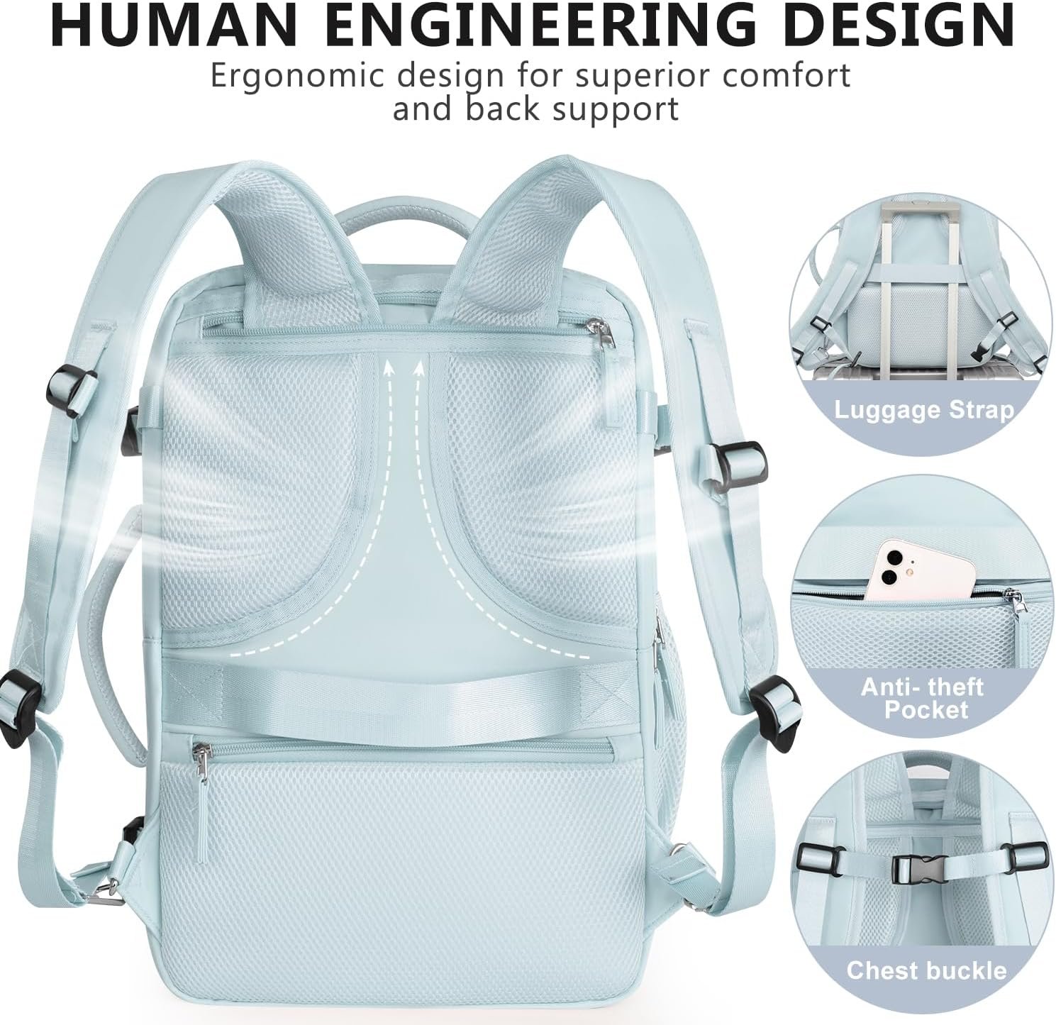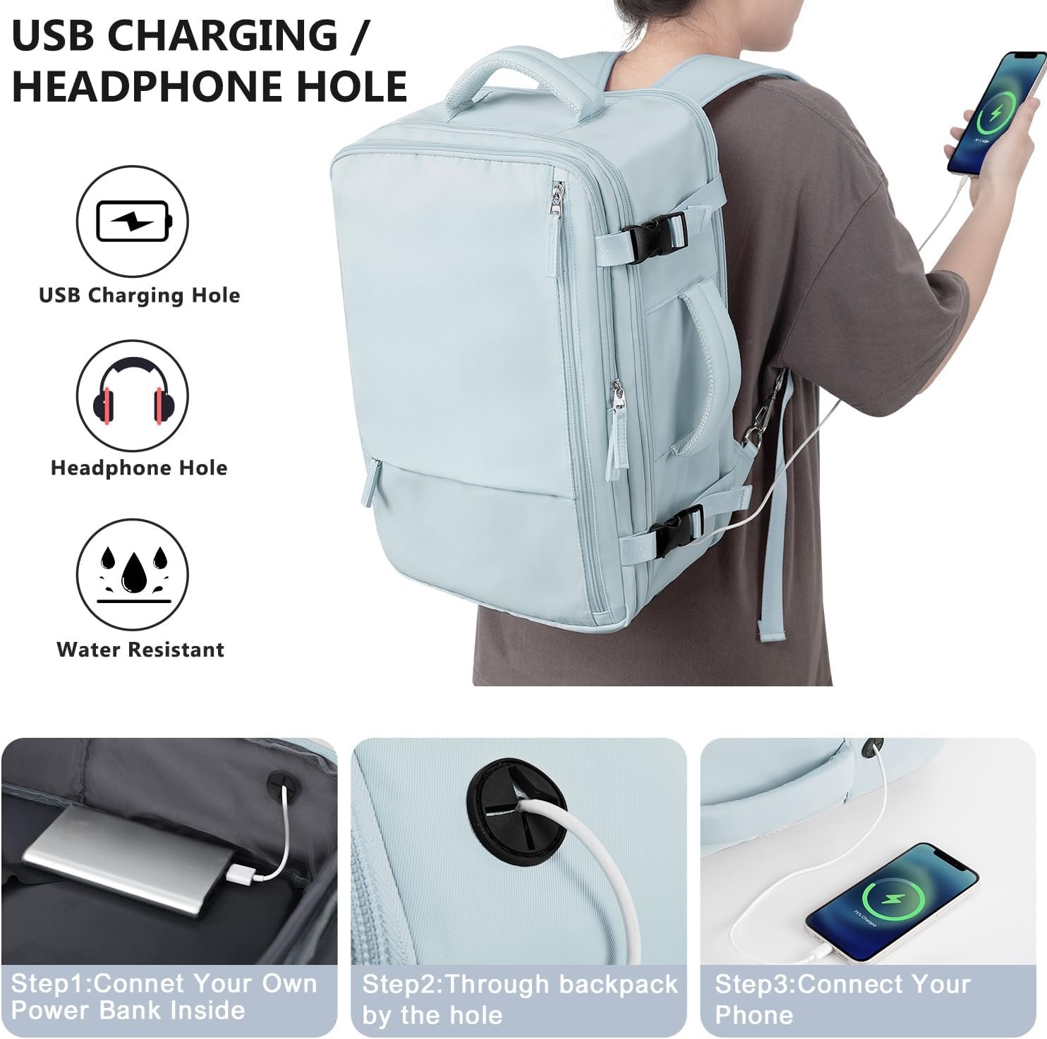 Charging Hole & Anti-Theft Design: Our carry on backpack have charging hole desgin allows data cable pass through, so you can charge your phone while walking. Also, the anti-theft pocket on the back of the travel backpack for women mens allow you to put phone, passport or wallet in it. Making your journey and travelling more convenient wherever you go