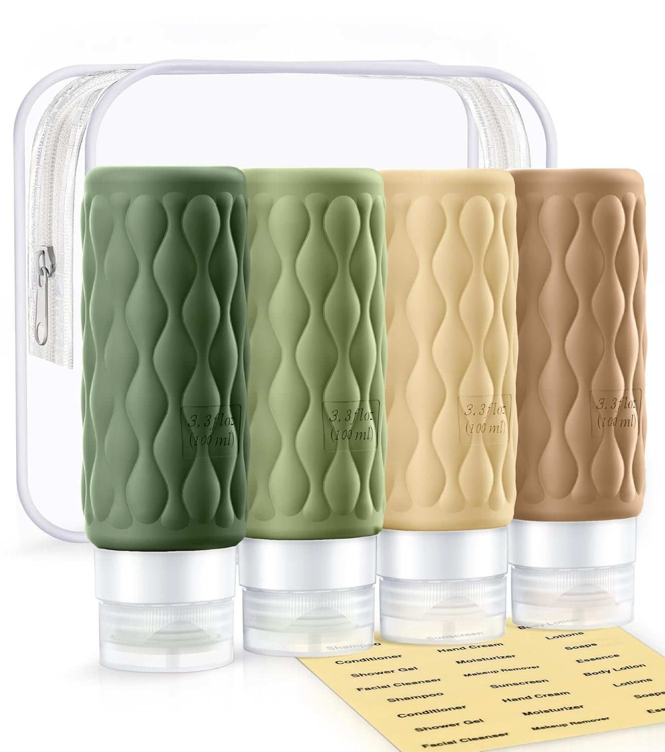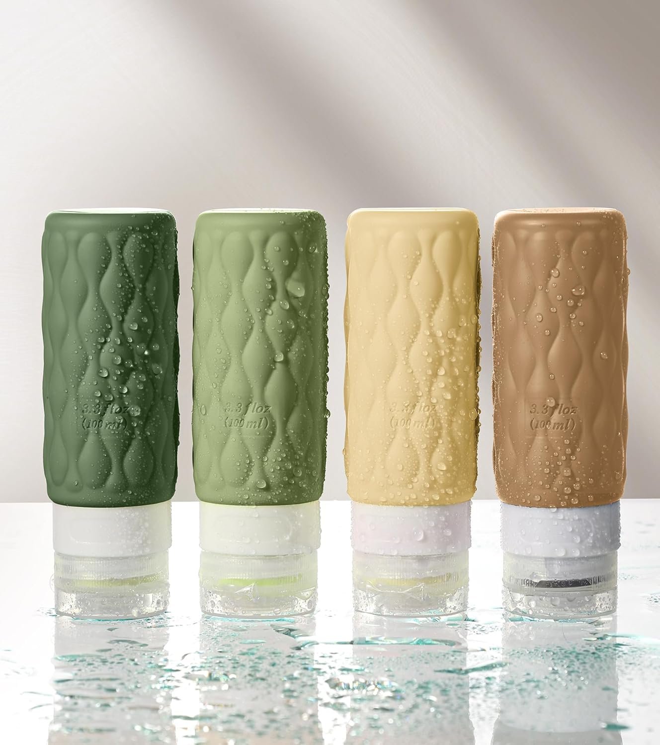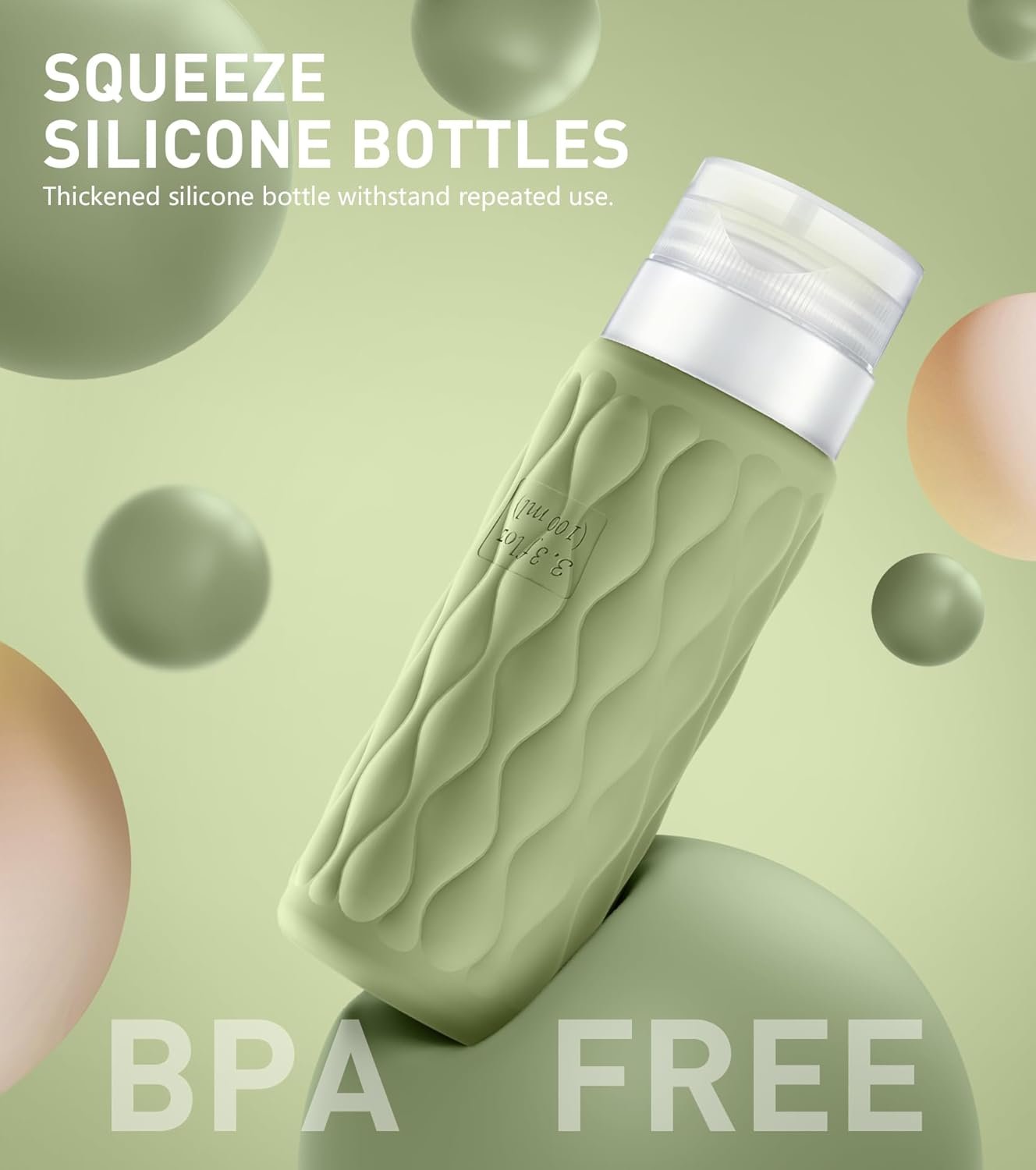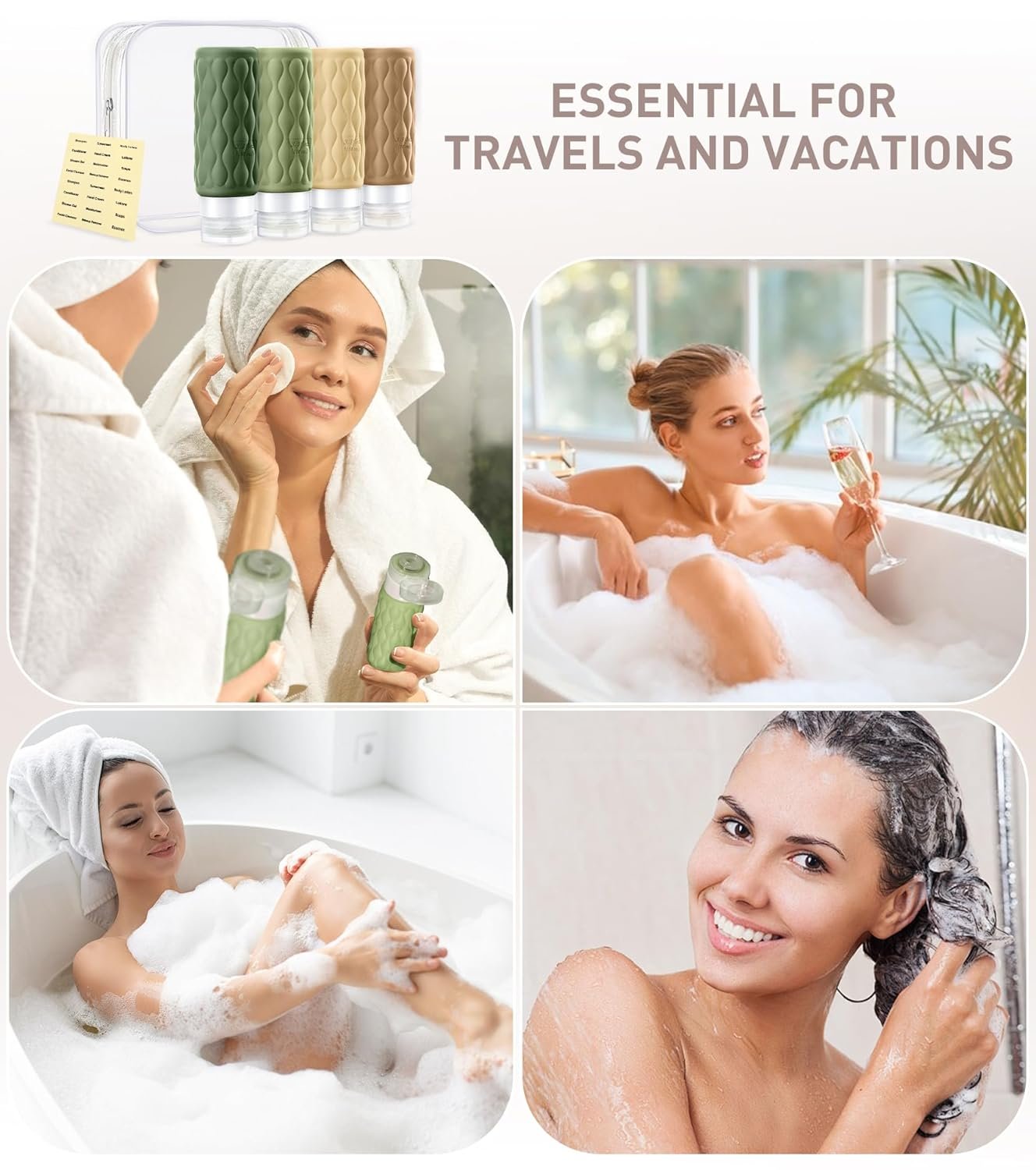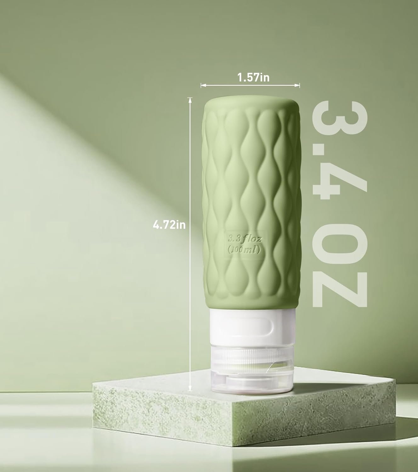 TRAVEL ESSENTIALS SET: This set includes 4 travel-size bottles (3.4 fl. oz, 100 ml), offering a compact solution for carrying various liquids such as shampoo, lotion, or other toiletries. The bottles are made of BPA-free silicone, ensuring that the liquids will not be contaminated with any toxins