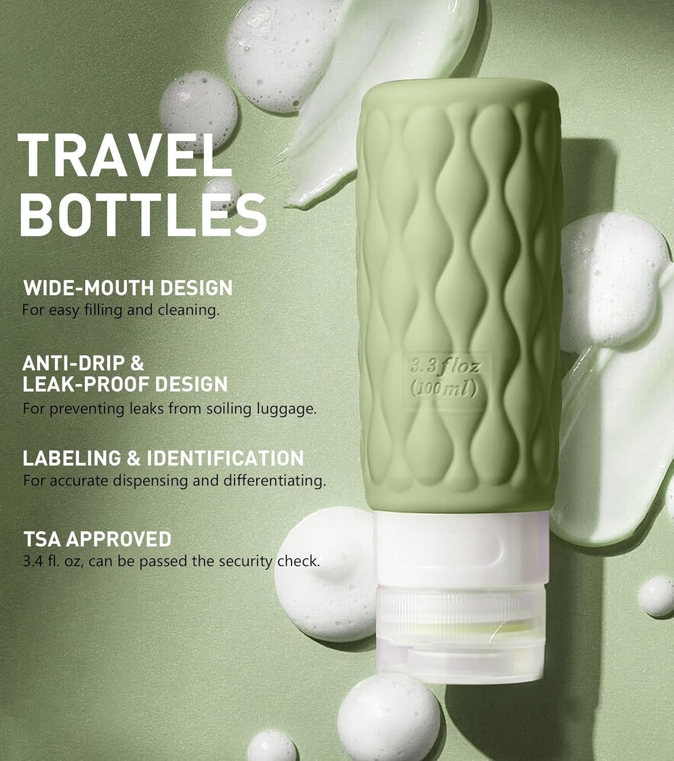 Travel Bottles for Toiletries, 3.4 oz TSA Approved Silicone Travel Shampoo Bottles with Clear Toiletry Bag and Label, Travel Essentials for Shampoo and Conditioner, Green