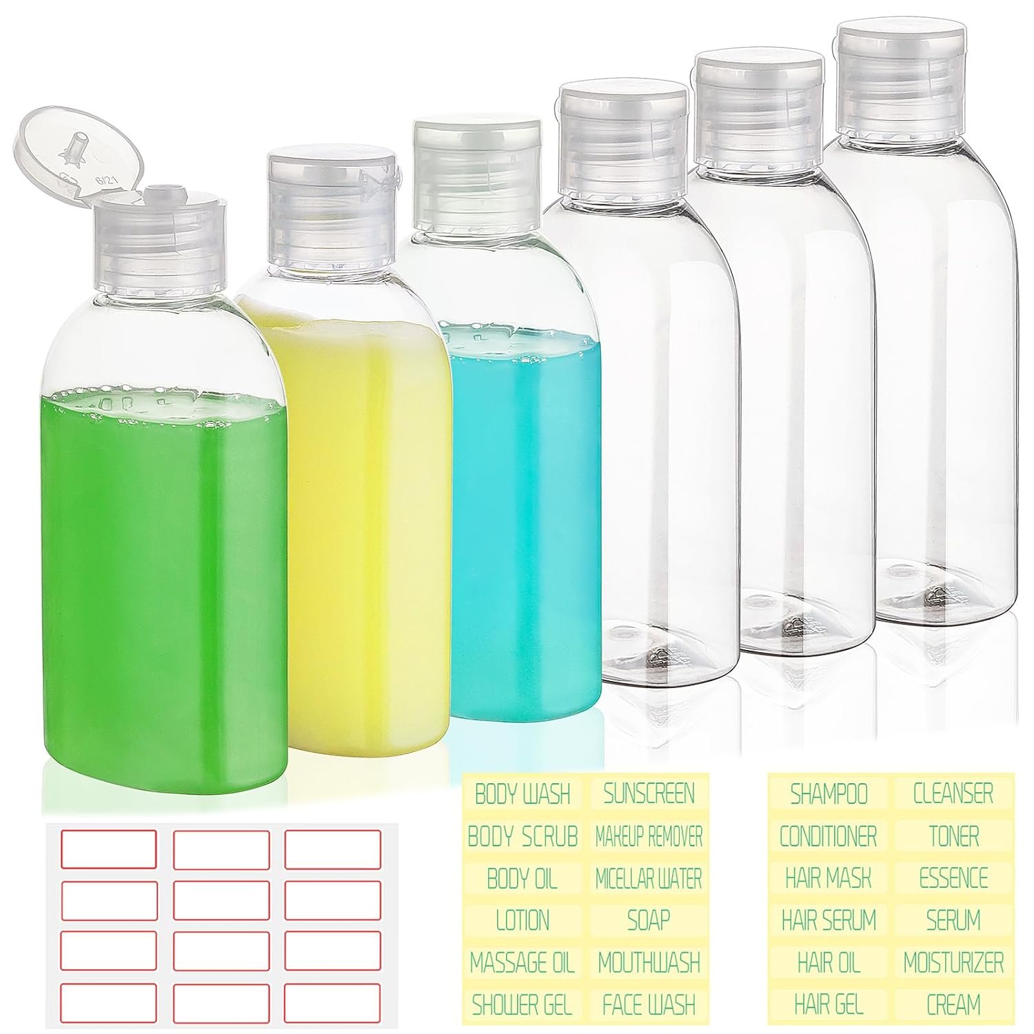 PVersatile Travel Size Toiletries: These 3.4oz/100ml travel bottles for toiletries are blank, 2 label with words stickers can easy to identify your travel bottles. Please Note:Not Recommended for Thick Liquids or Creams. These travel size containers are ideal for thin liquids like shampoo and body wash but not work well with thicker products.