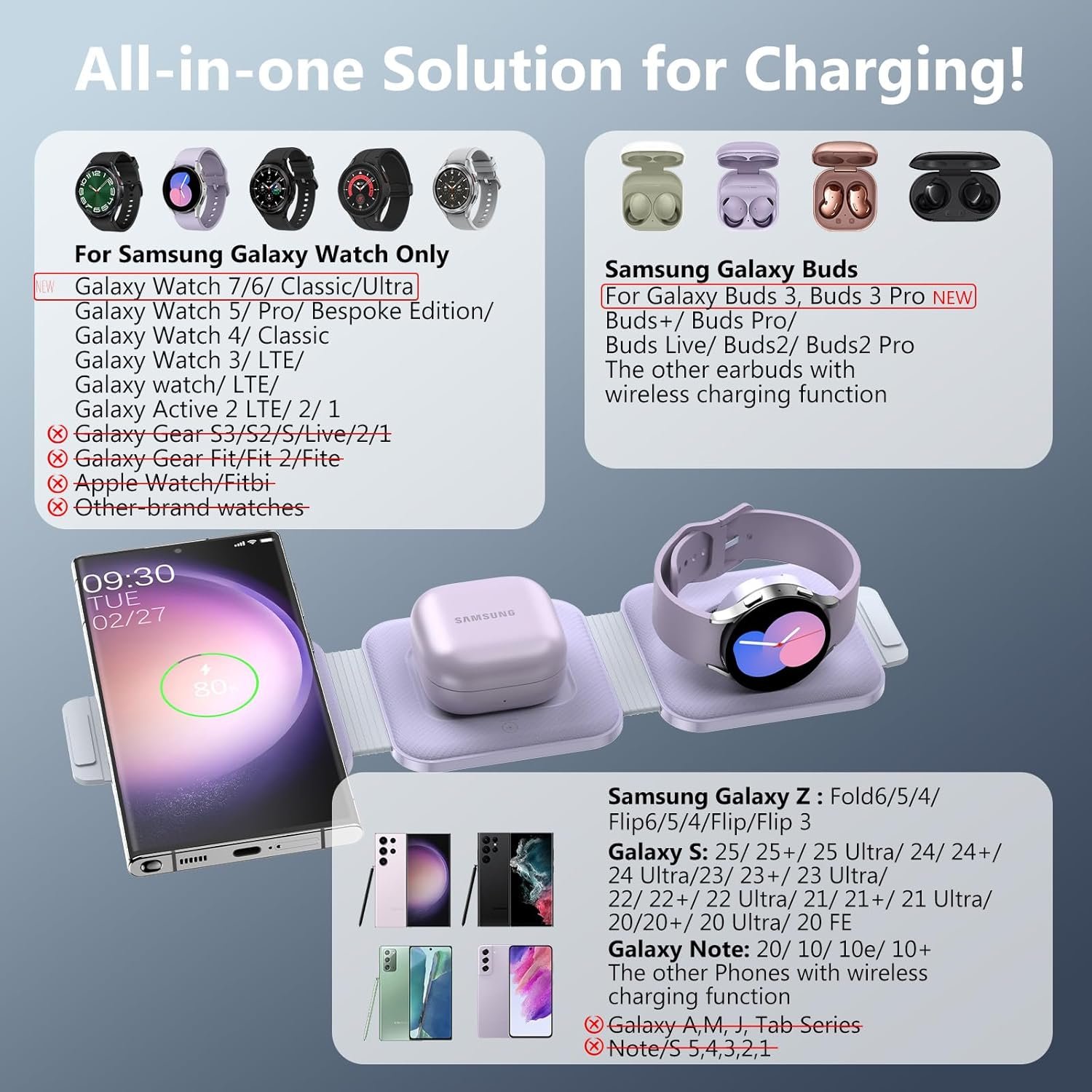 WIRELESS CHARGER FOR SAMSUNG:All-in-one solution for charging! compatible with Samsung suite of devices, For Samsung Galaxy S25/S24/S23/S22/S22+21Ultra/S21/S21+/21Ultra/S20/S20+/S20 Ultra/S 20 FE (5G Version) Galaxy Note20/10,Galaxy Z Flip 6/5/4/Z Fold6/5/4 and other Phone with wireless charging function. For Galaxy Buds3/2/Pro/Live/Buds+ and other TWS earbuds. ONLY compatible with Samsung Galaxy Watch, Galaxy Watch 7/6/5/4 Classic/Active 2 LTE/2.(NOTE: Not support for Galaxy Watch “Gear” Series)