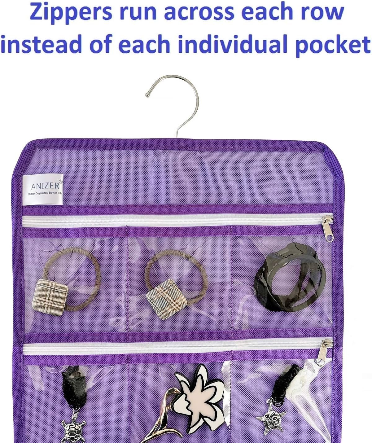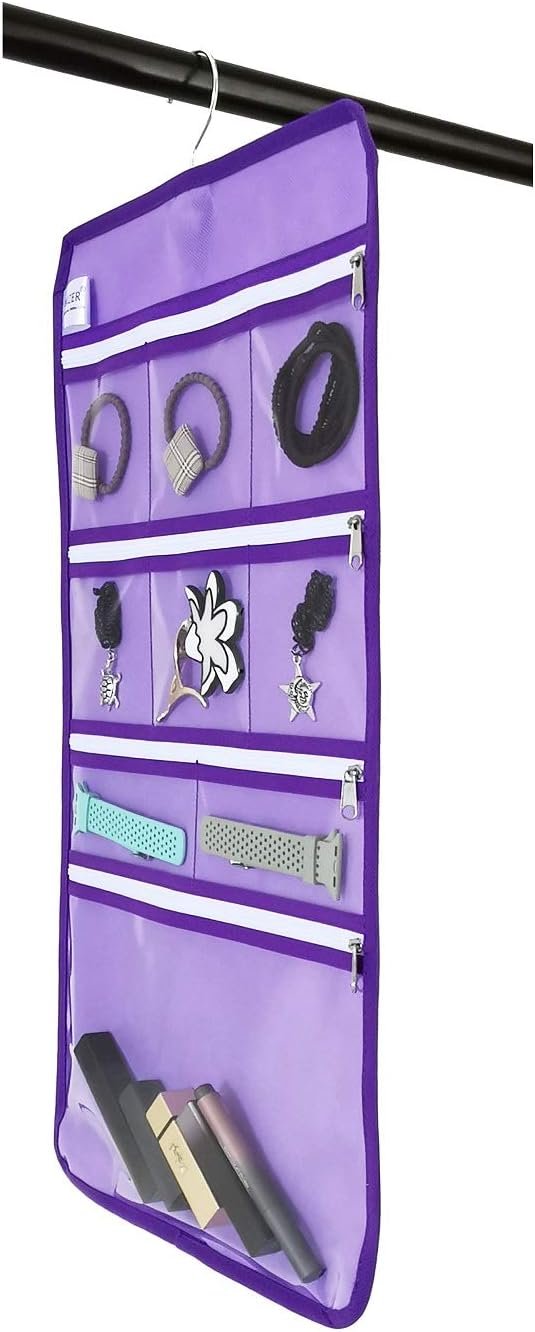 Travel Foldable Jewelry Rolls Bag Hanging Jewelry Organizer with 9 Zippered Clear Pockets Storage Pouch with Rotatable Hanger (PURPLE)
