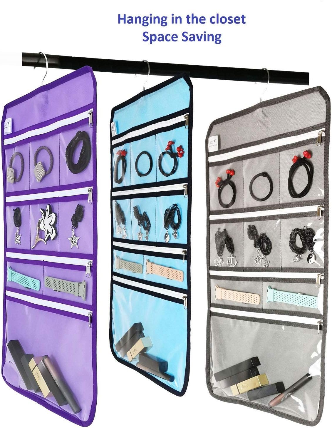 Jewelry storage bag with clear pockets to store earrings, rings, bracelets, necklaces, watchbands, brooches and hair accessories etc. Easy to find the items in the pouch.