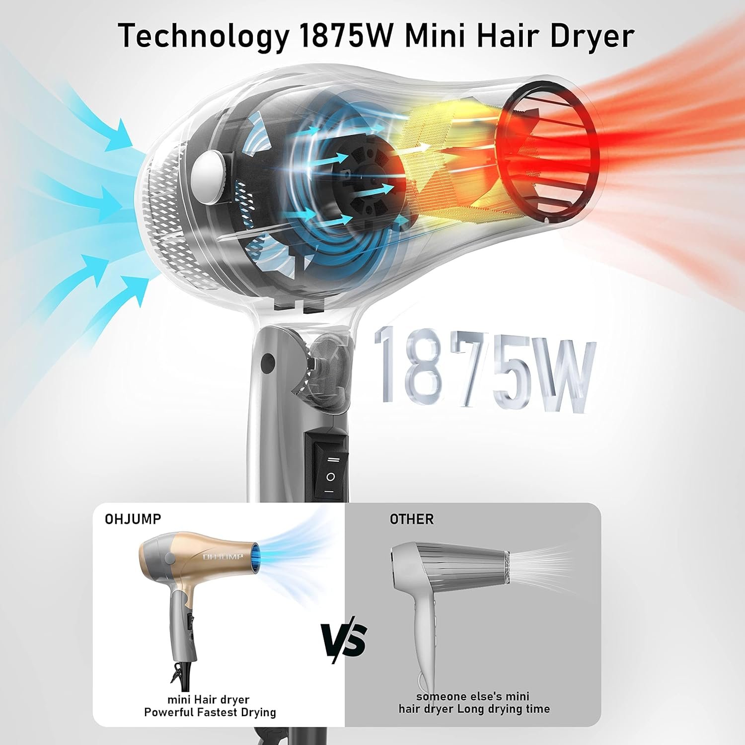 【Powerful and Fast Drying】Our mini hair dryer is equipped with 1875W DC motor, the travel blow dryer delivers strong airflow at a speed of up to 27m/s. The blow dryer fan blades ensure stable airflow, resulting in a drying speed that’s 100% faster than other similar models. The ion technology helps fight frizz and provides deep nourishment to your hair, the european travel blow dryer is suitable for all hair types.