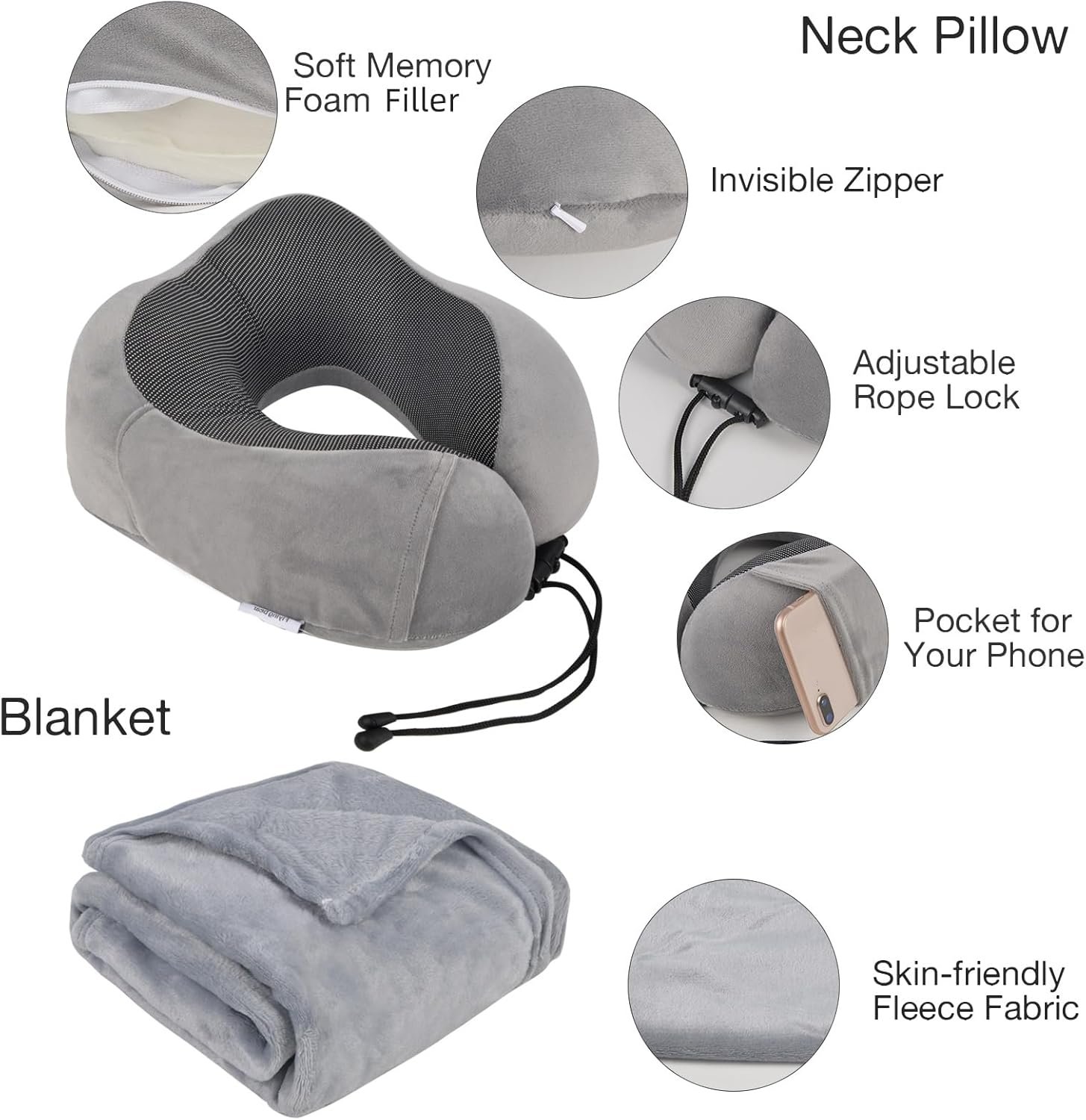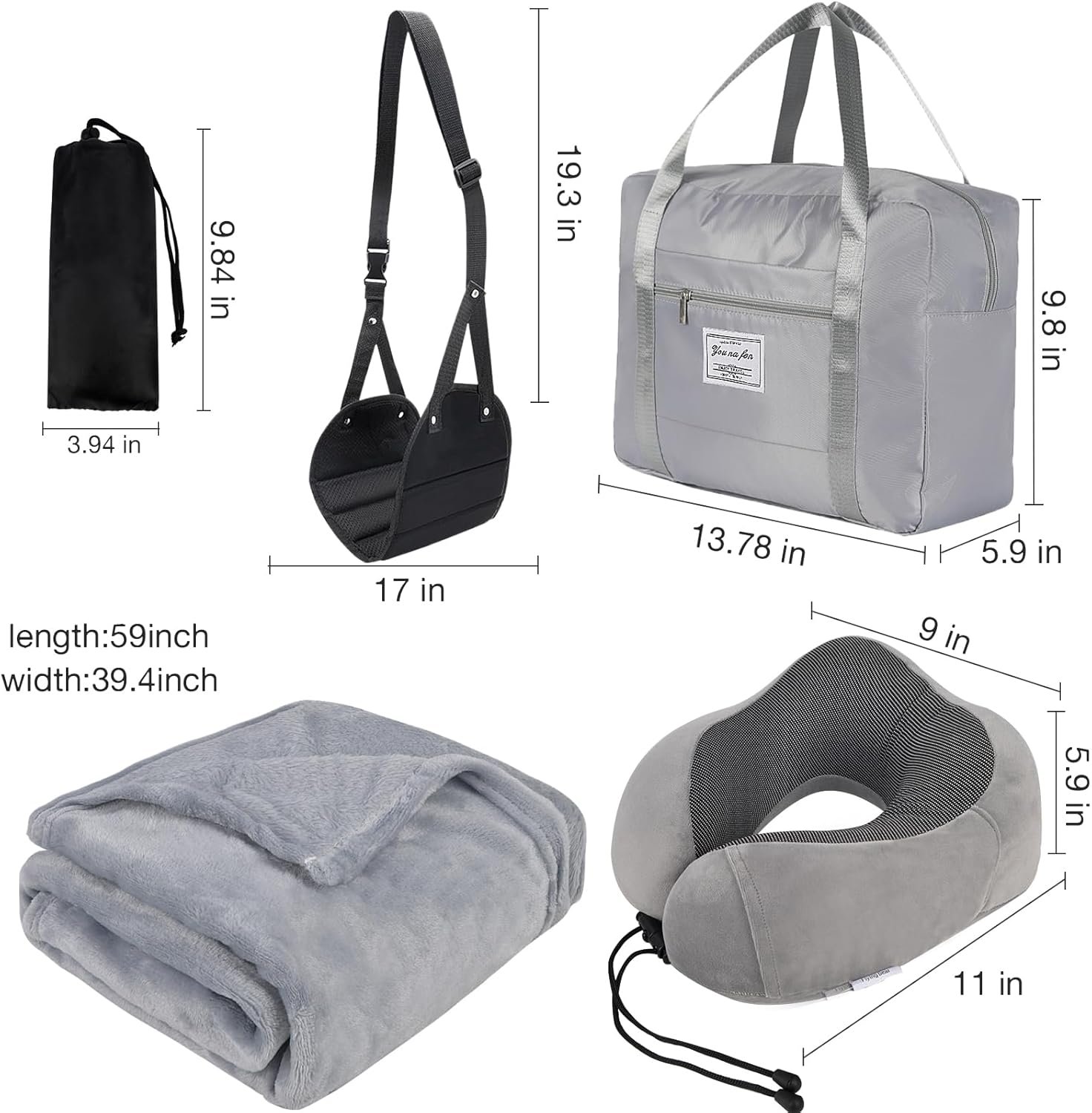 Travel Pillow and Blanket Set & Foot Rest, Memory Foam Neck Pillow Airplane Blanket & Airplane Foot Hammock & Foldable Duffel Bag, Eye Mask & Earplugs, Portable Travel Accessories Essentials, Grey