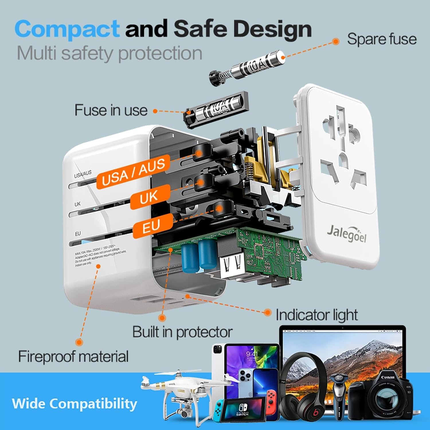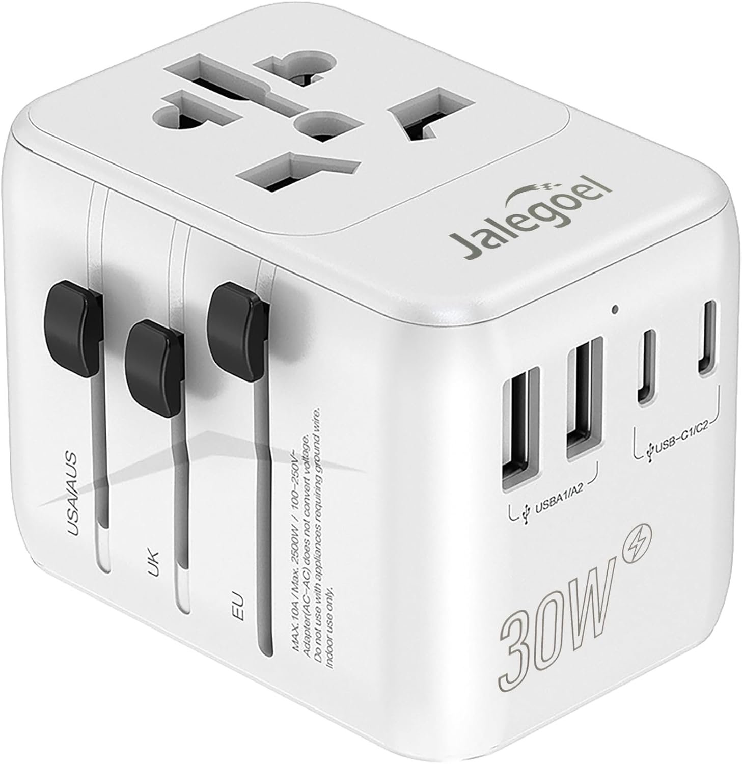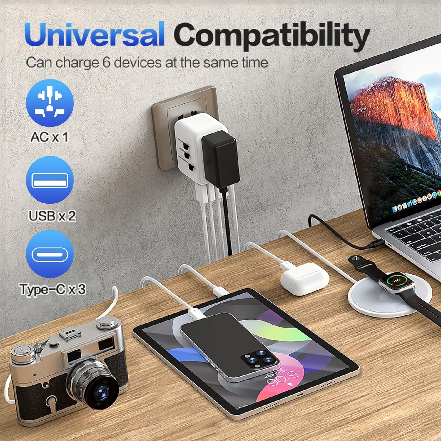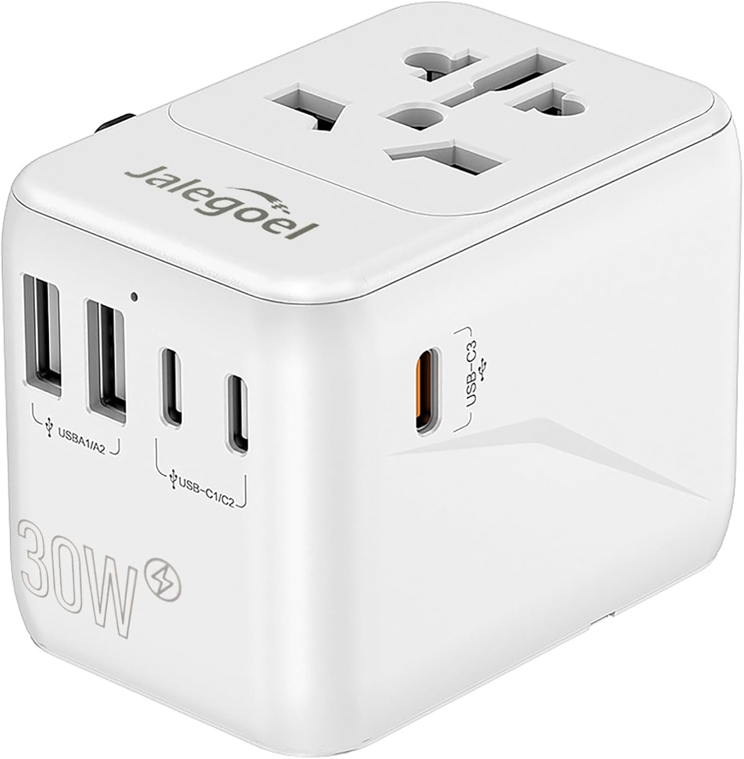 Compatible with 100-250V power outlets in over 150 countries with interchangeable plug tips.Features Dual USB-A output 5V/3A Max, Dual USB-C output 5V/3A Max,1 USB-C PD 30W.Lightweight and compact ( 2.52*1.88*2.75in) design fits easily into any carry-on bag or suitcase.