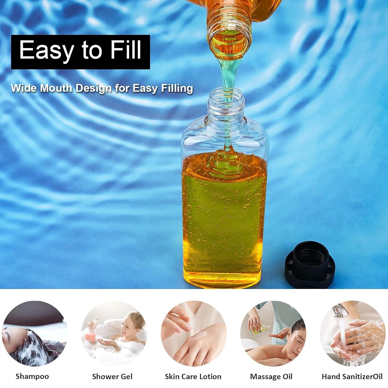 Versatile Travel Essentials:These travel bottles perfect for a variety of personal care products, including Hair Conditioner, Body Lotion, Facial Cleanser, Bath Shower Gels, Hair Shampoo, Liquid Hand Soap, Liquid Soap, and Facial Moisturizing Lotion. Plus, enjoy the added convenience of waterproof label stickers for easy identification.