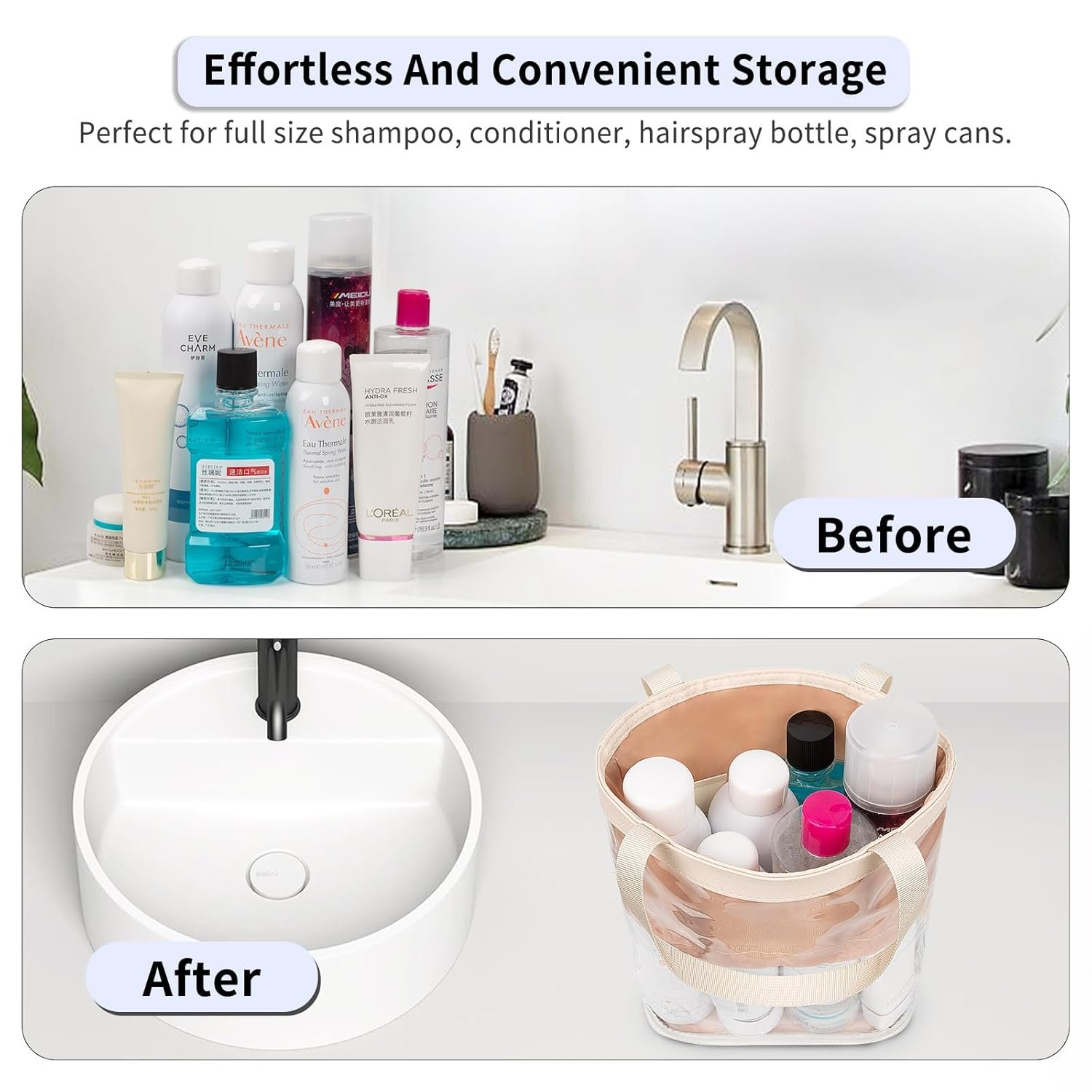 Large Capacity: Size 8.3*4.7*10.6 inch, clear toiletry bag is designed to hold all your personal essentials in one place: full-size shampoo bottles, beauty products, medicines, shaving cream, razors, hair dryers, makeup, dental care, body lotion, baby care products and more.