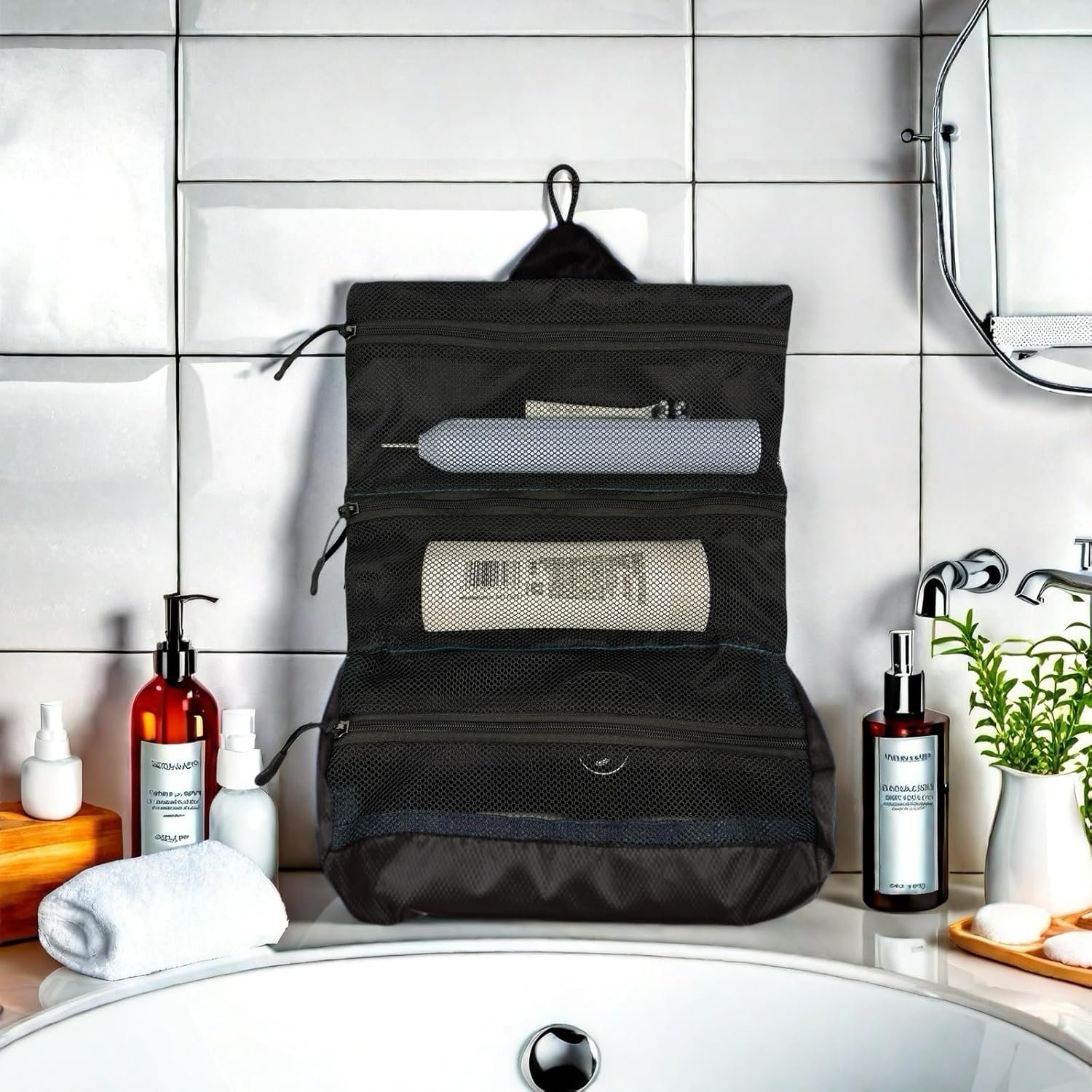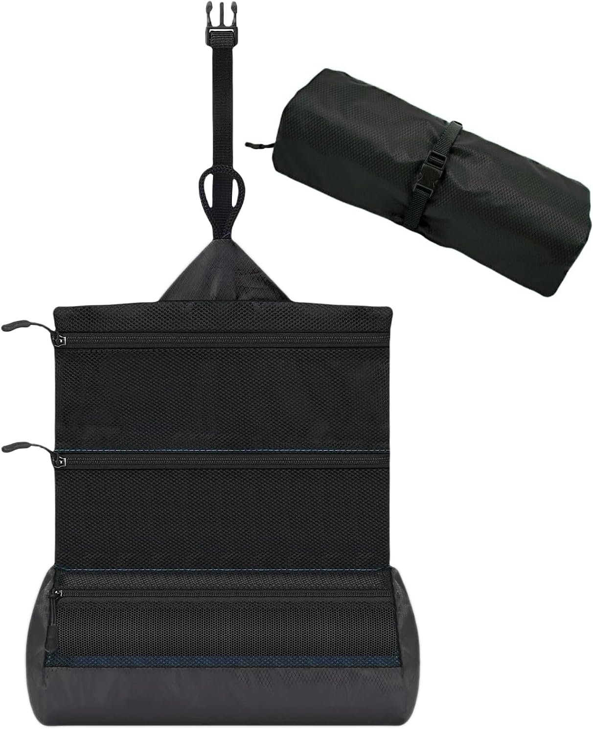 【Convenient Hanging Design】Featuring a sturdy hanging hook, this hanging toiletry bag can be easily suspended on towel racks or door knobs, ideal for travel essentials during camping, hiking, or business trips. The secure lock design ensures your travel toiletries stay organized and accessible.