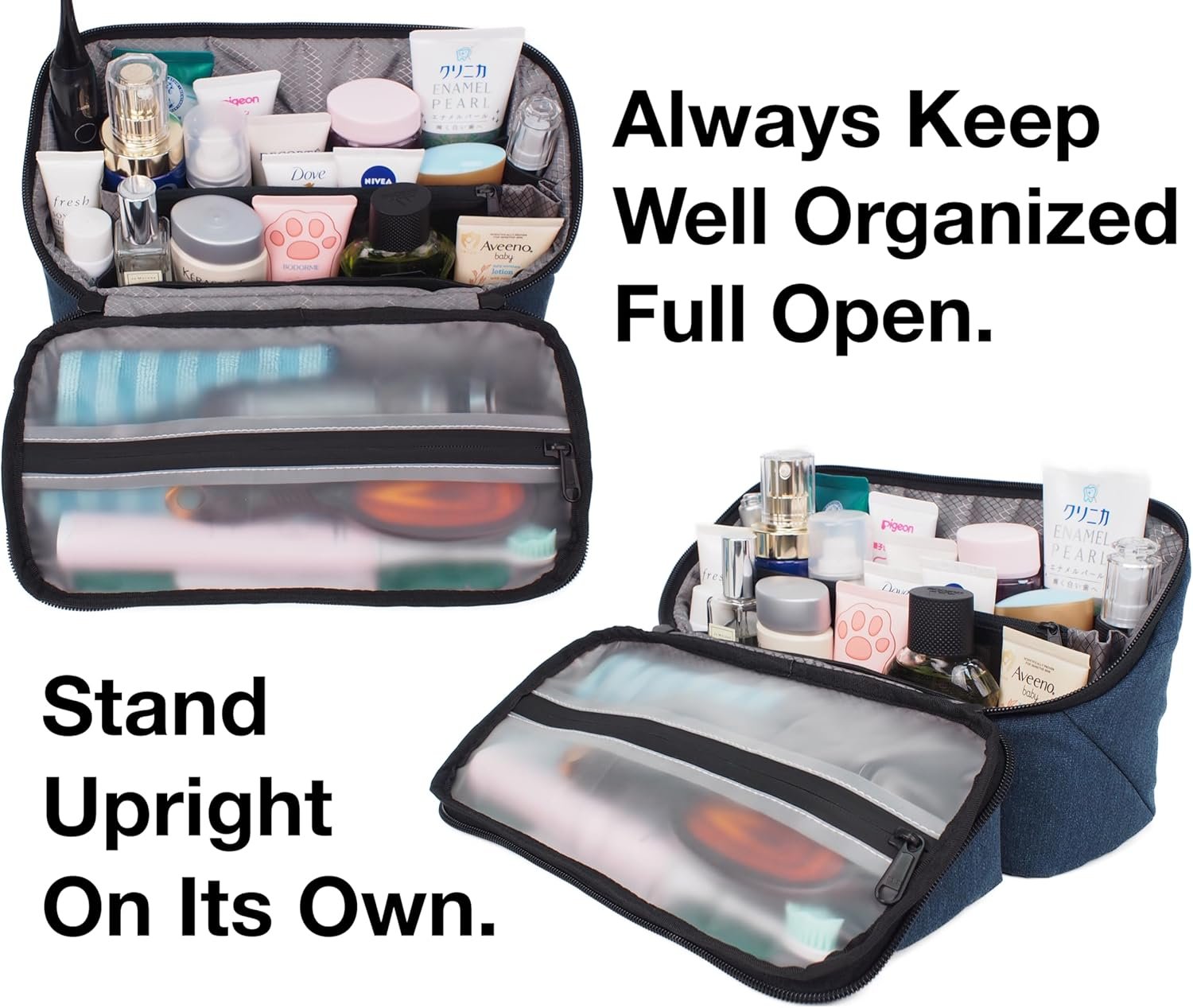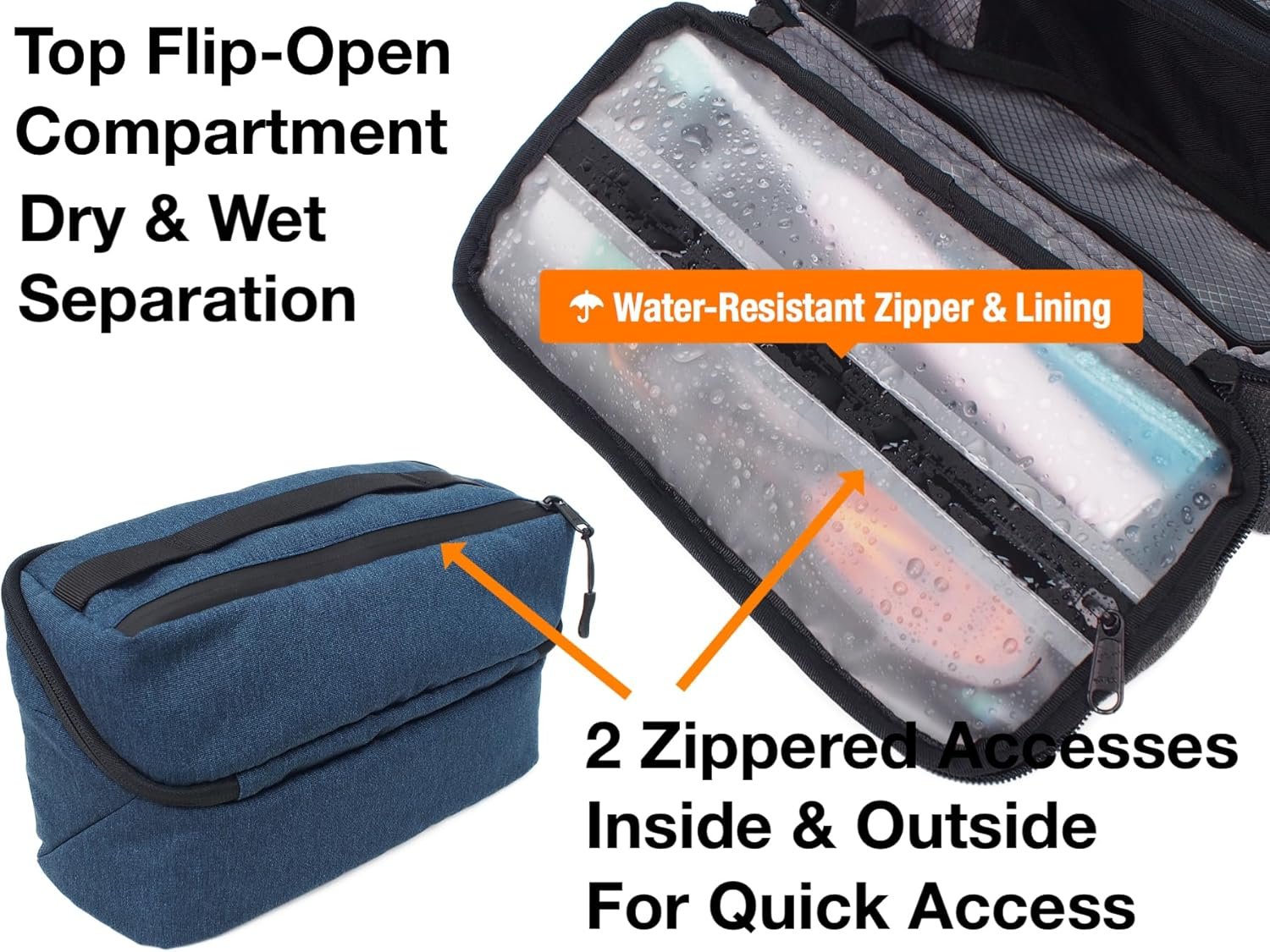 【Separate Compartment】Apaval travel toiletry organizer features a large 3D compartment on the top, built up with a visible, water-resistant lining and leak-proof zippers, dedicated to keep wet and dry items separated, such as towels, toothbrushes, shower poufs, and bath sponges. The top pocket can lay flat when it unfurls, 2 zippered accesses from both interior and exterior to keep everything ready to deploy.