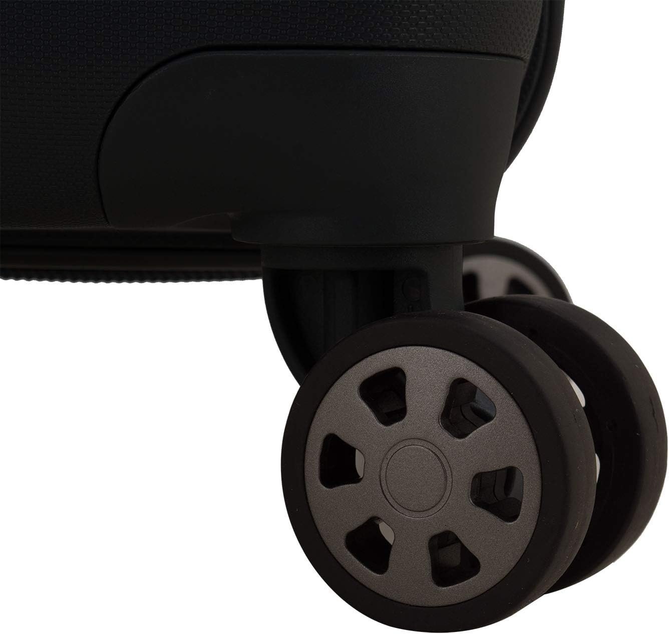 Spinner wheels provide 360° rolling maneuverability through crowds and airports. Multi-stage telescoping handle with push button mechanism. Top and side rubber carry handles provide easy lifting and carrying.