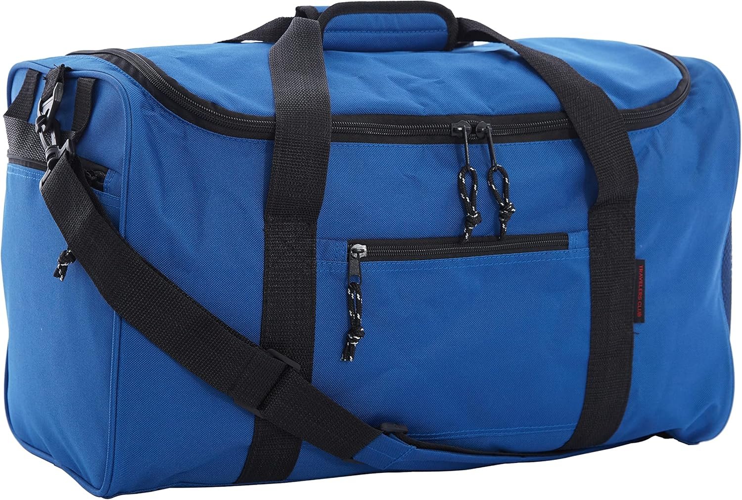 Additional features include zip-close side pockets, top and side carry handles, and adjustable/removable shoulder strap on the duffel bag