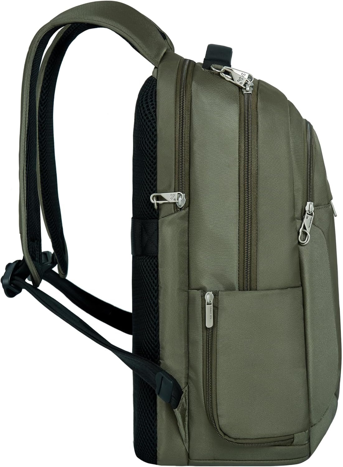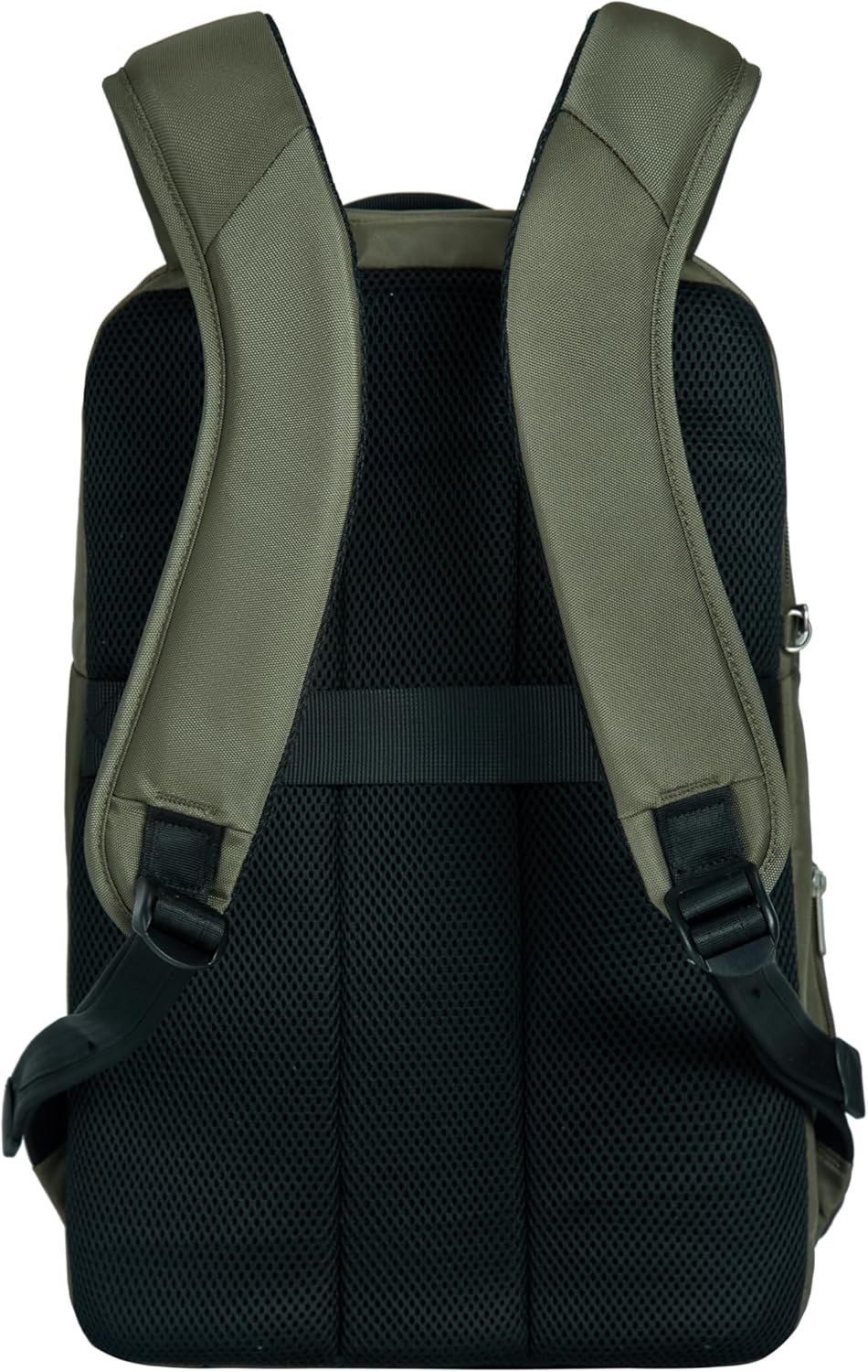 Air mesh back panel and backpack straps for comfort, mesh expansion pocket holds a water bottle, top grab handle and add-a-bag strap