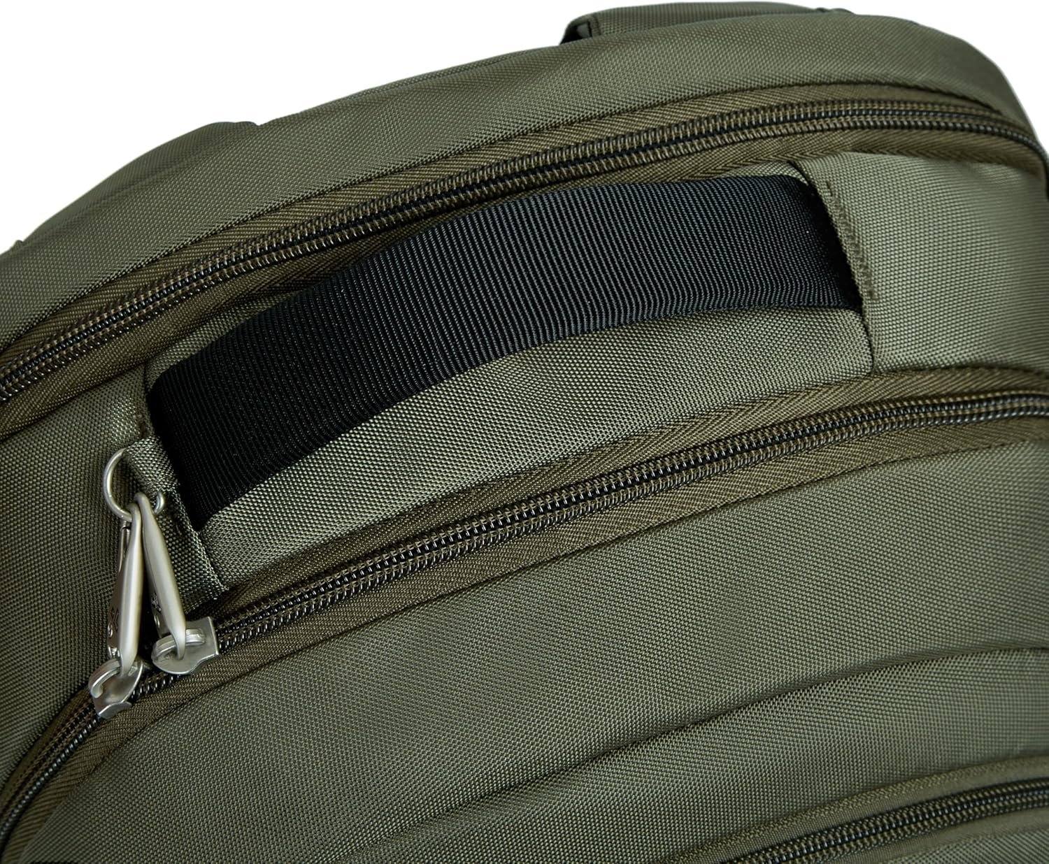 Front compartment has an organizer with RFID blocking card and passport slots, an open and a zip top pocket, 2 pen loops and a tethered key clip