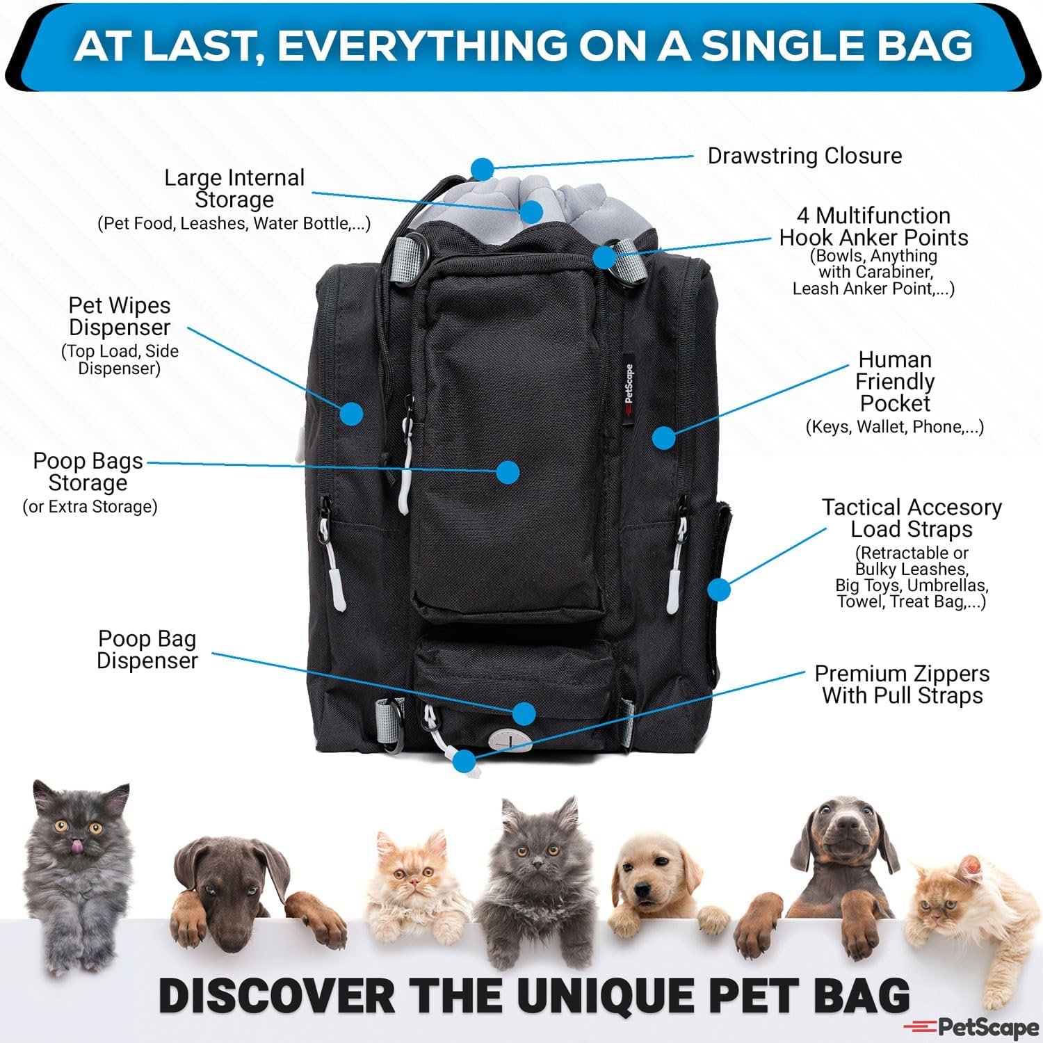equipped for any situation on the go. With dedicated spaces for poop bag dispensing, poop bag storage,