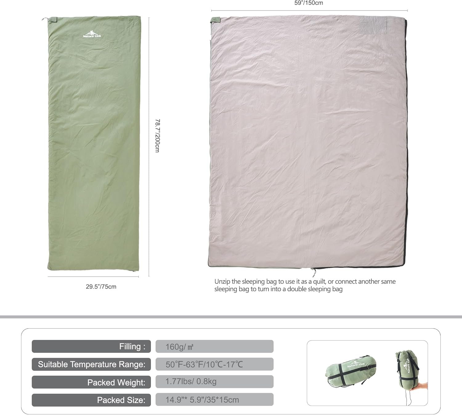 ULTRALIGHT AND COMPACT: weighs just 1.77 lbs, can be compressed down to 11” in height. This ultralight sleeping bag is filled with 160g/㎡soft imitation silk cotton insulation, provides a comfortable temperature rating of 50℉-63℉. It rolls up small and comes with a handy stuff sack.
