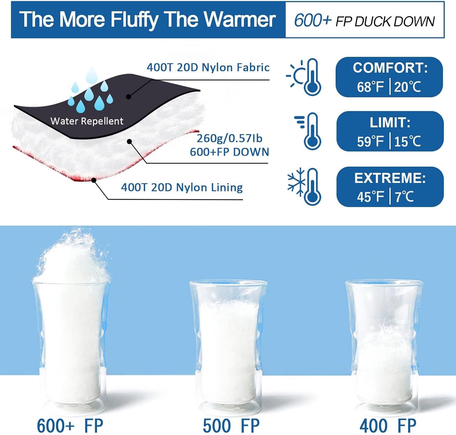 【 𝐊𝐄𝐄𝐏 𝐖𝐀𝐑𝐌 】The camping sleeping bag is filled with 9.2oz selected duck down with 600 Fill Power, suitable for warm weather. Pure natural and healthy material, fluffy and soft, no odor or impurities. The sleeping bag specially adds a 1.6 ” cloth strips for wind protection. Comfortable Temperature:59°F-68°F, Limited Temperature: 45°F, your great choice for summer sleeping bag!