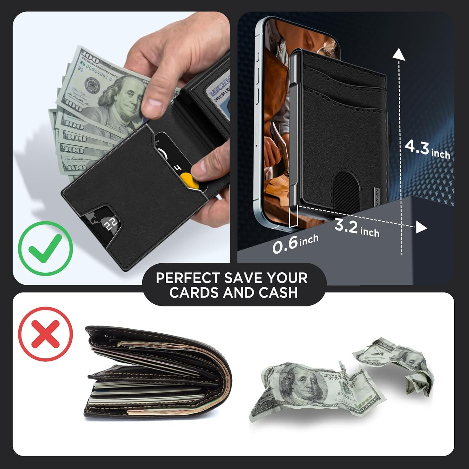 【Ample Storage Space】: Despite its slim design, our minimalist wallet for men can hold up to 12 cards. The aluminum card holder can accommodate 6 cards, and the leather cover provides space for an additional 3-4 cards. You can also insert 1-2 cards on the back of the wallet. The built-in cash slot can store 10+ bills and features an ID window for driver’s licenses. This wallet for men offers plenty of storage space without compromising its slim profile.