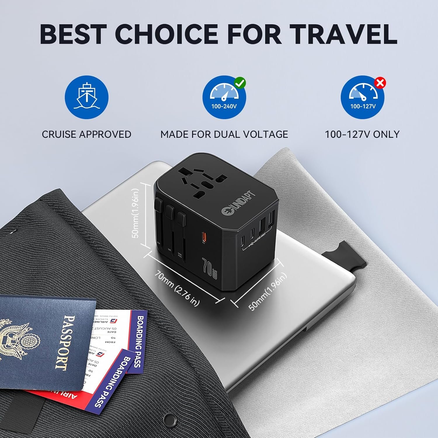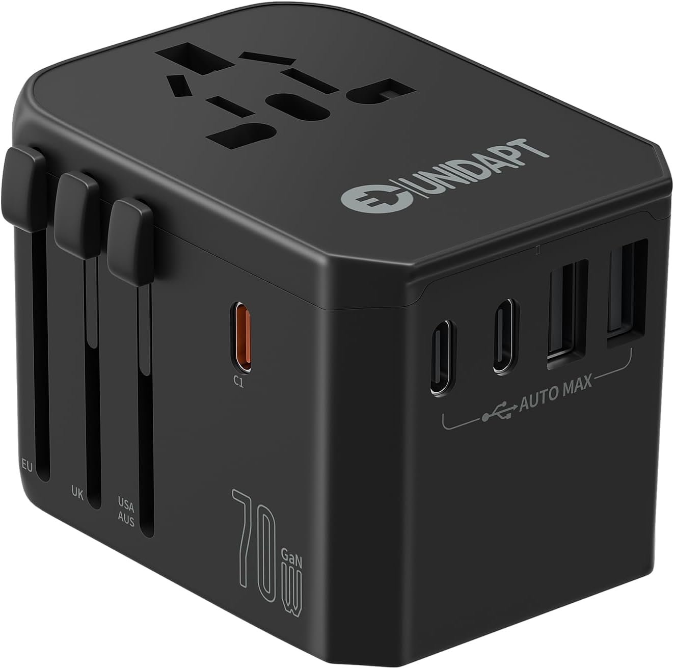 Unidapt Universal Travel Adapter, 70W International Plug Adapter with 3 USB-C PD Fast Charging & 2 USB-A Quick Charger Worldwide Adaptor for USA EU UK AUS Black (JY305-MAX)