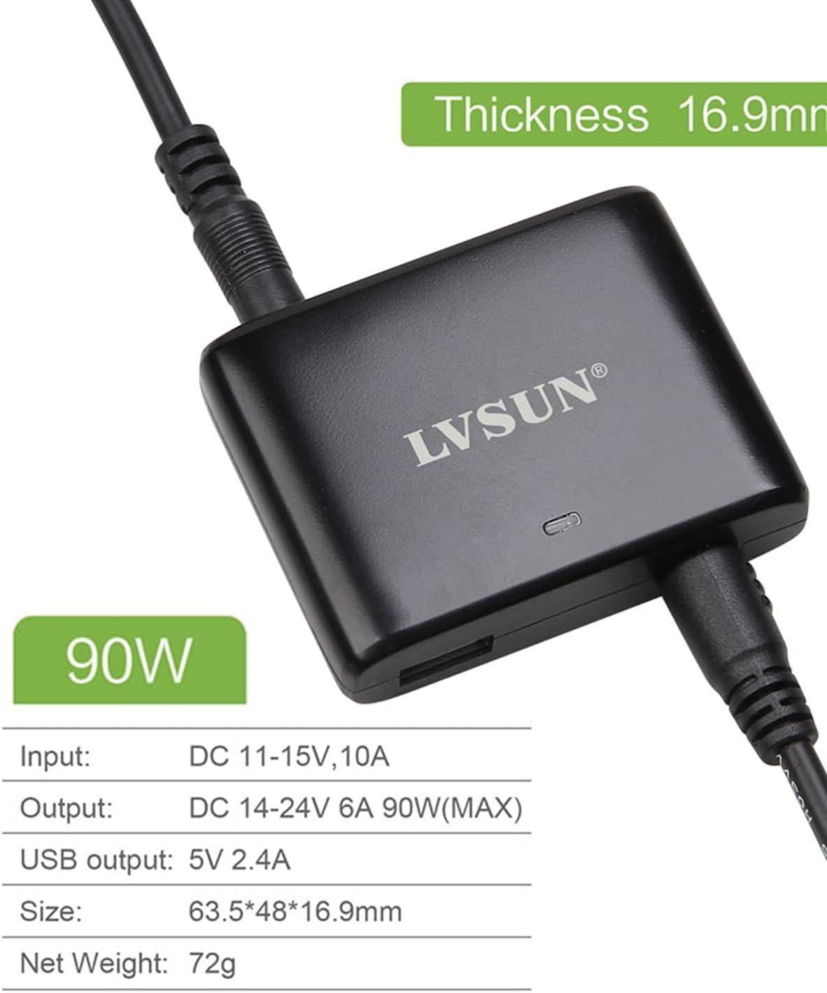 Input: DC 11-15V 10AOutput: 14-20V 6A 90W(max)USB output: 5V 2.4ASize: 63.5*48.9*16.9mmTotal Power: 90W.