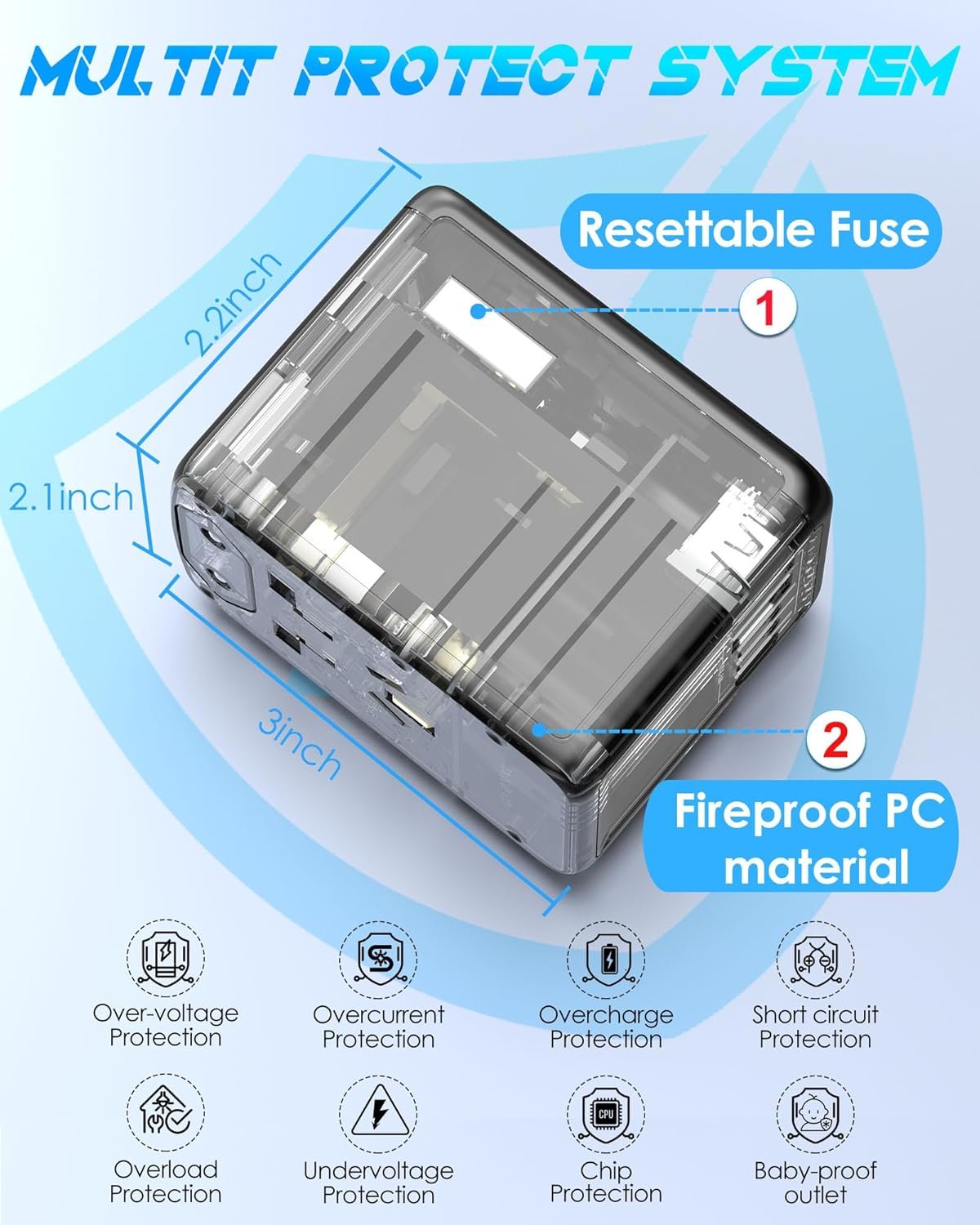 🌐 Superior Safety Mechanisms✈️ — Get rid of the trouble of manually changing fuses! Our international travel adapter built-in an advanced AUTO-RESETTING FUSE to protect your gadgets from power surges and short circuits, max 8A. Plus our travel plug adapter has safety shutters and a plug lock system, 94v0 fireproof shell, etc. Certified by RoHS, CE, and FCC, ensuring its safety and reliability.