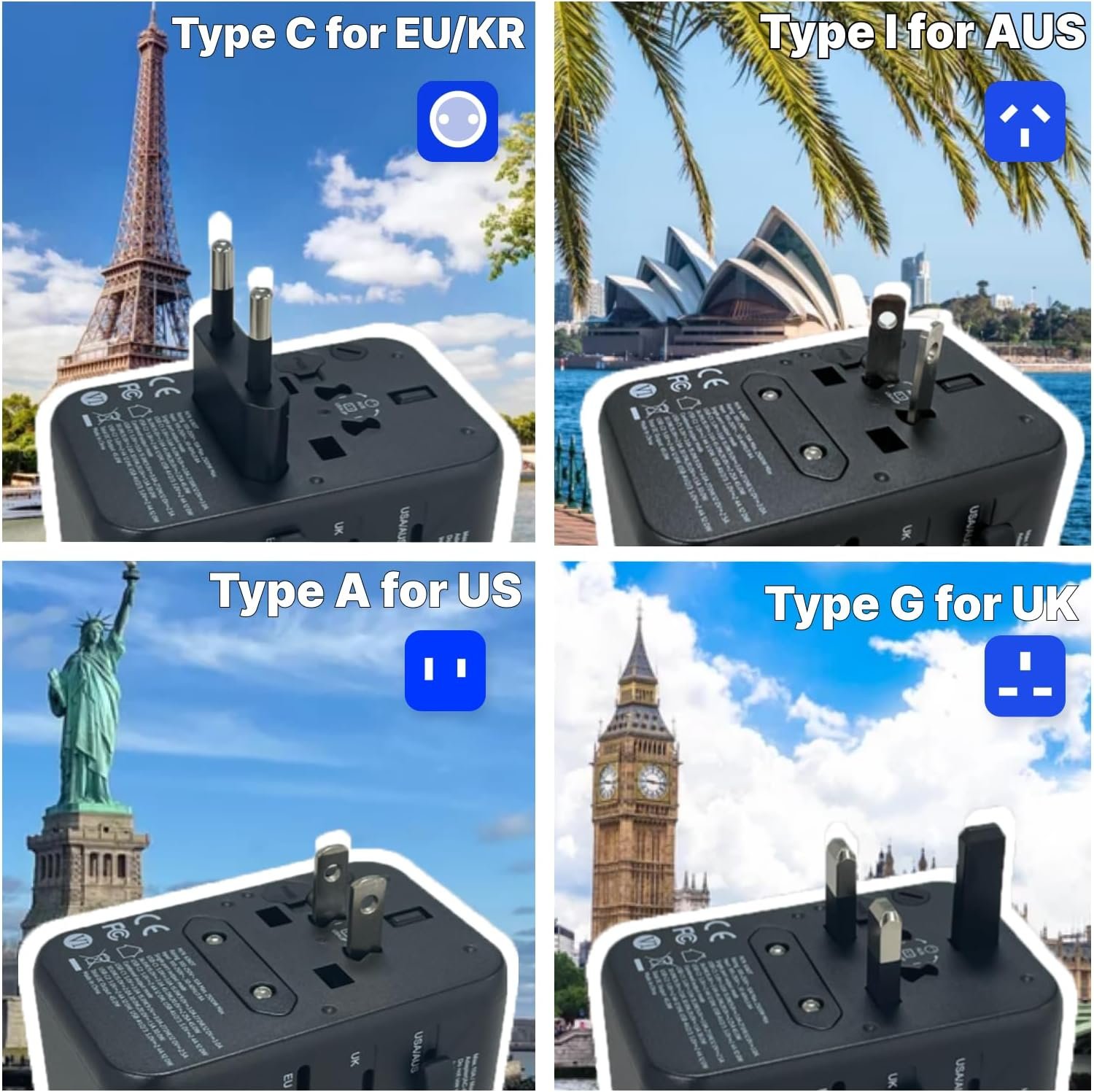 6 IN 1: Our universal travel adapter has a multi plug. No need to bring chargers for multiple devices. With 3 USB-A and 2 USB-C plugs, you get a type c charger that can charge your iphone, samsung, or any other electronic device!