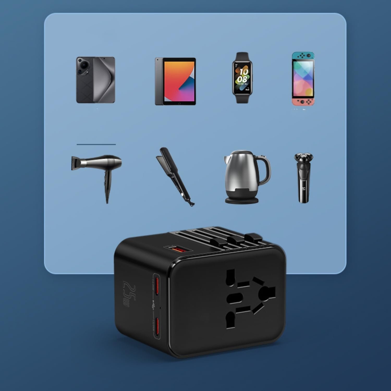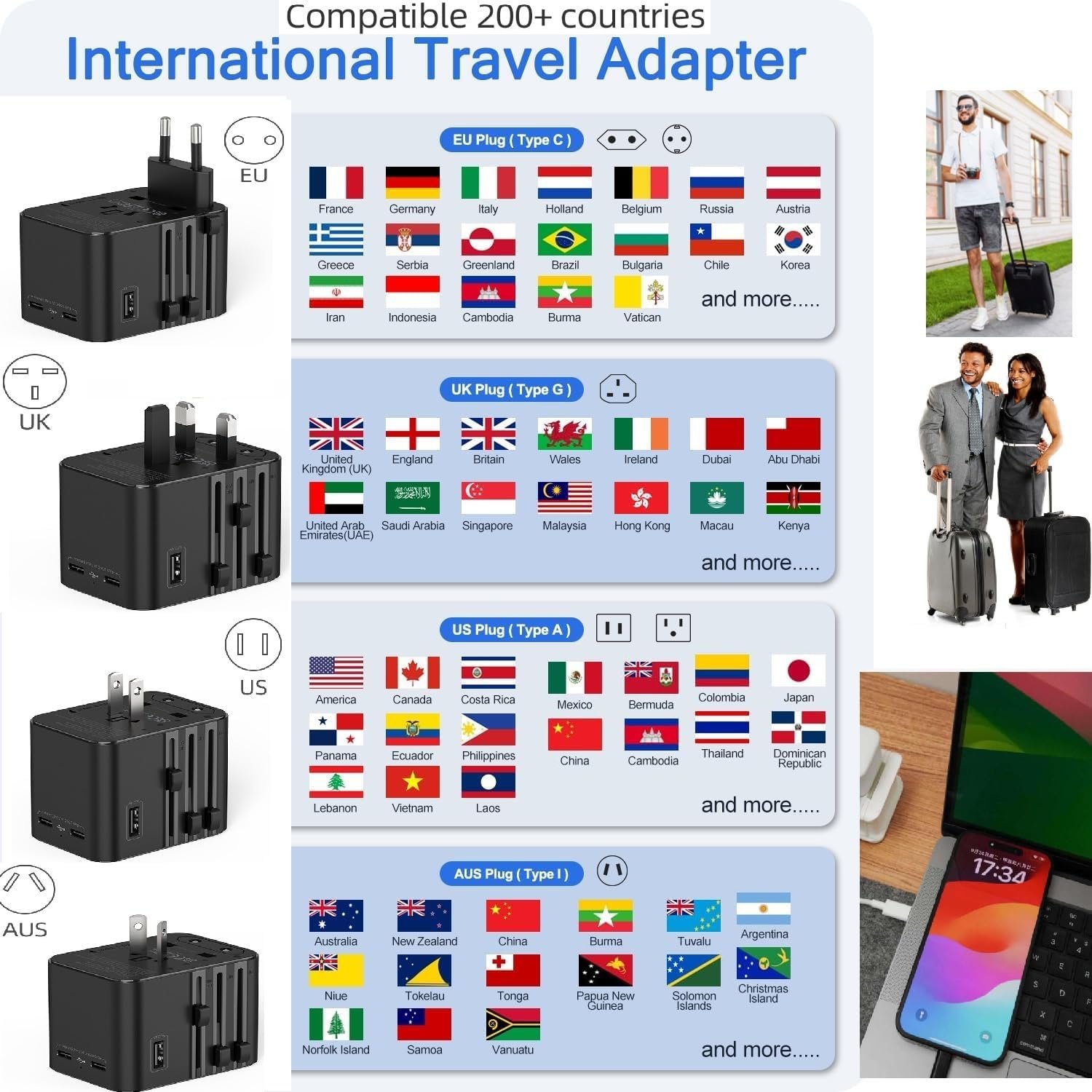 Travel Plug Adapter Universal Fit: Compatible with all devices (phones, laptops, tablets, cameras).Features 2 USB-C port and 1 USB-A ports, allowing you to charge up to four devices simultaneously, including smartphones, tablets, and laptops.Smart 4 USB Ports: This universal charger is compatible with almost all USB Devices like Apple iPhone 16/15/13/12/,7/6S/5S/4S, Samsung Galaxy S7/S6/S5/S4, Sony, Nokia, HTC, LG, HUAWEI, ZTE, Bluetooth Speaker,Digital Cameras and so on.