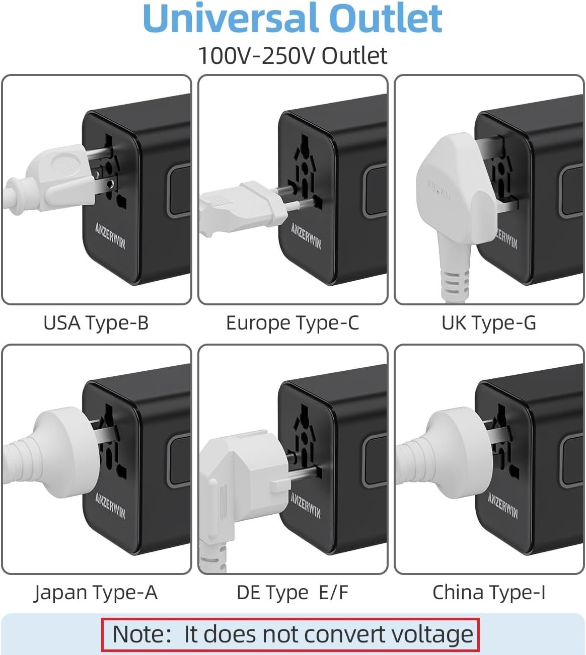 Universal Travel Adapter Worldwide Compatibility: Works in US, EU, UK, AUS, and over 200 countries.This travel plug adapter worldwide covers 200+ countries: Type C Plug: Most of Europe, France, Italy, Spain, Iceland, Greece, Israel, South Korea, Brazil, Peru, Argentina, Chile; Type G plug: UK, Ireland, Malaysia, Hongkong, Dubai; Type A Plug: America, Canada, Mexico, Thailand, Japan, Taiwan, China(Mainland); Type I plug: Australia, New Zealand, China and more. AC outlet accepts devices from US, EU, UK, AU, China