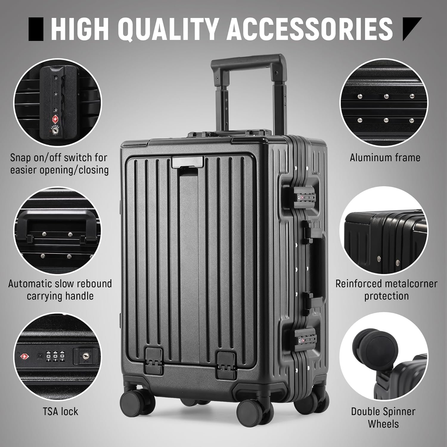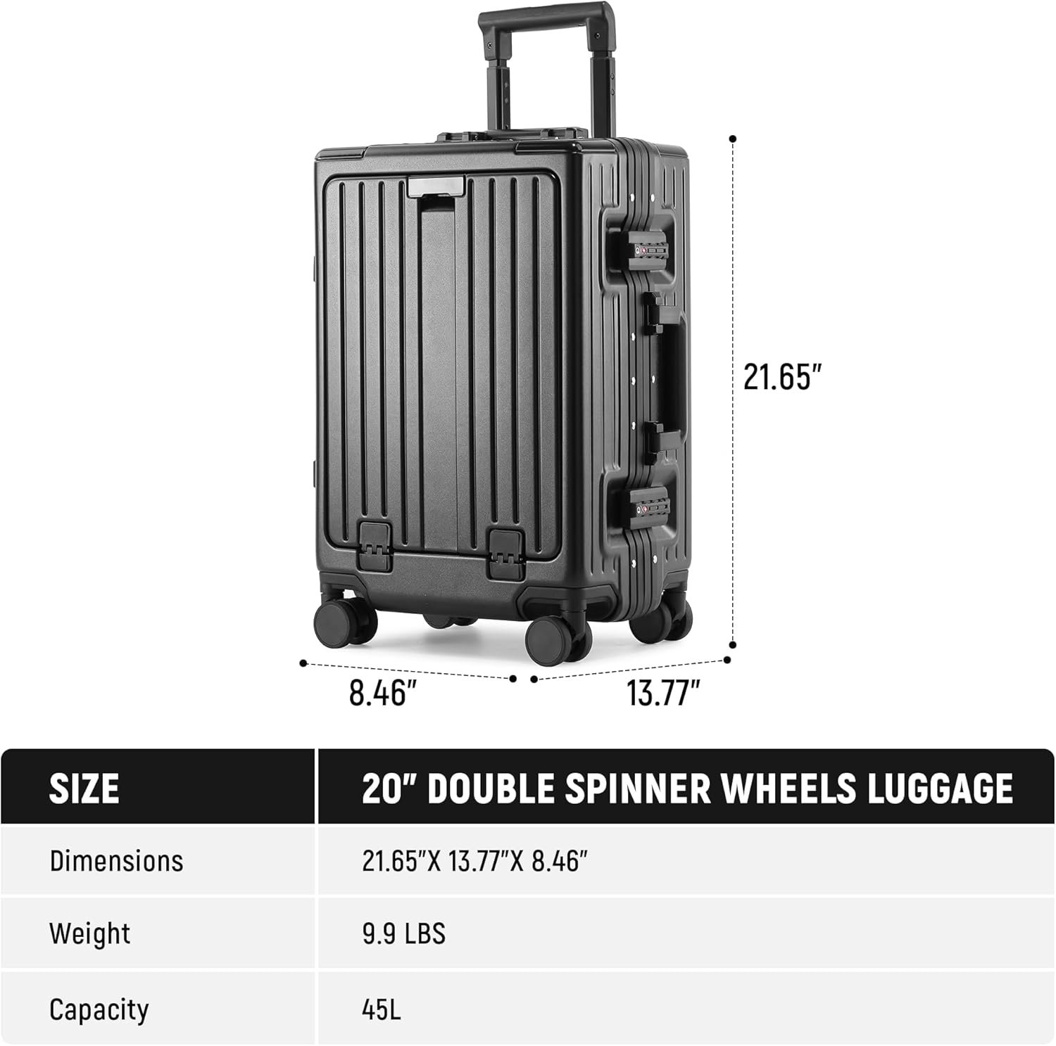 【360° Dual Spinner Wheels and TSA Locks】 TSA approved carry on luggage; 360° spinner wheels for smooth rolling; telescoping aluminum trolley bar with 3-position ergonomic adjustments for optimal height comfort.