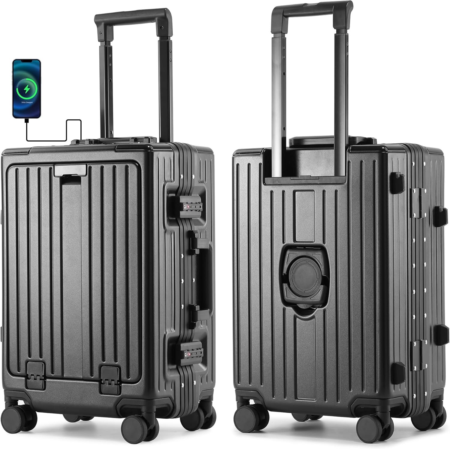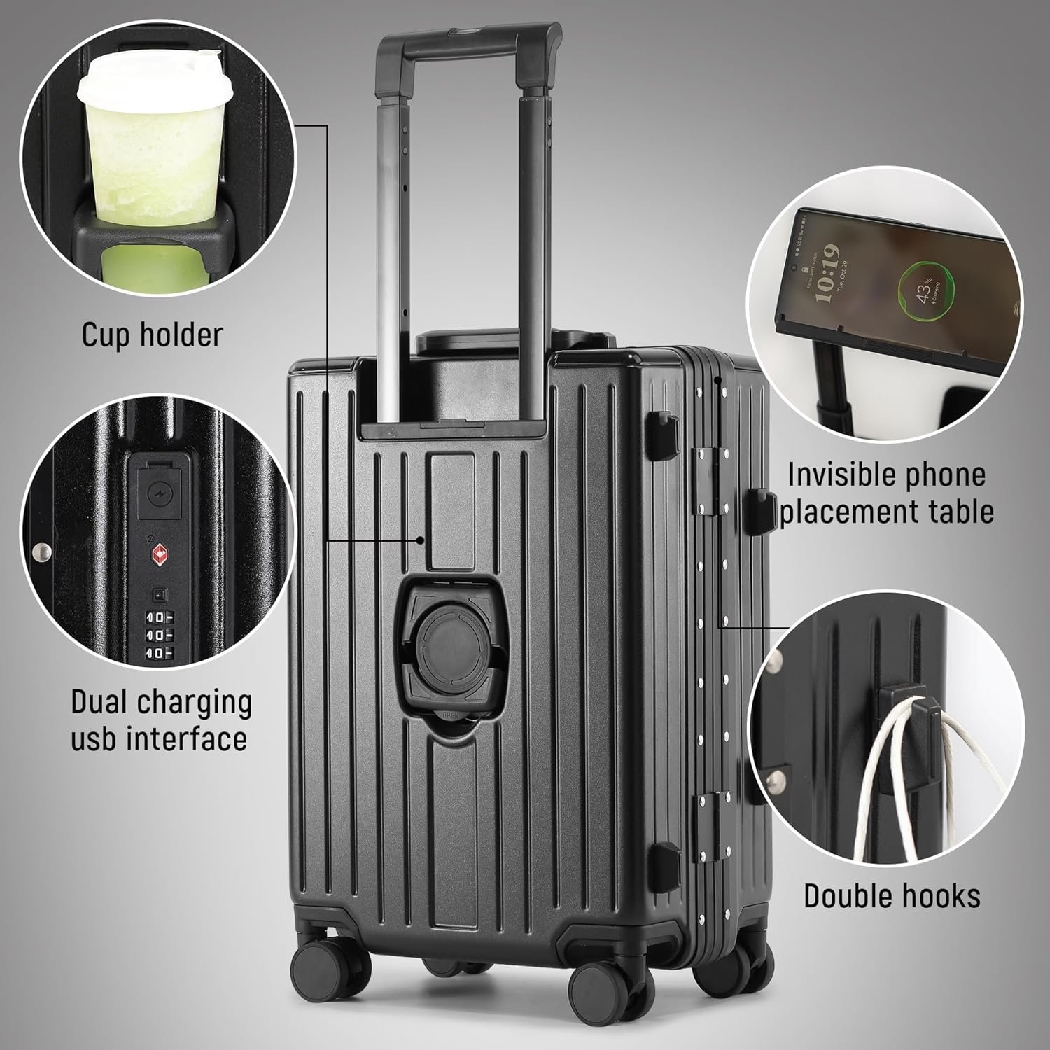 【Warm Design】 Travel luggage includes USB and USB-C ports, invisible cell phone platform design, cup holder design. USB and USB-C ports allow you to charge anytime and anywhere (the power bank is not included), while you can extend the invisible cell phone platform at the trolley bar, and the back of carry on suitcase is equipped with a stowable cup holder, so that you can easily enjoy a cup of coffee while traveling without having to worry about too much luggage.