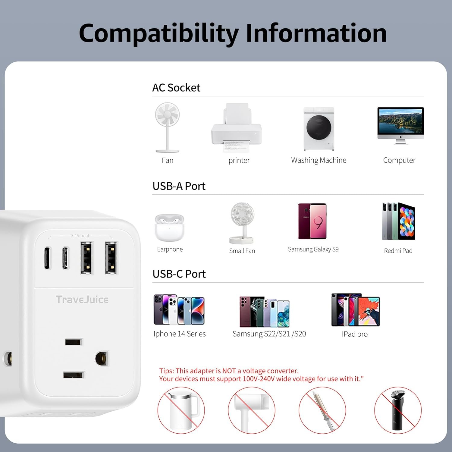 [100% Free Risk Purchase] – . If there is any problem with the traveJuice universal power adapter, we will send you a new replacement (1 year limited). If you have any questions, please contact us, and we will provide you with a satisfactory solution within 24 hours.