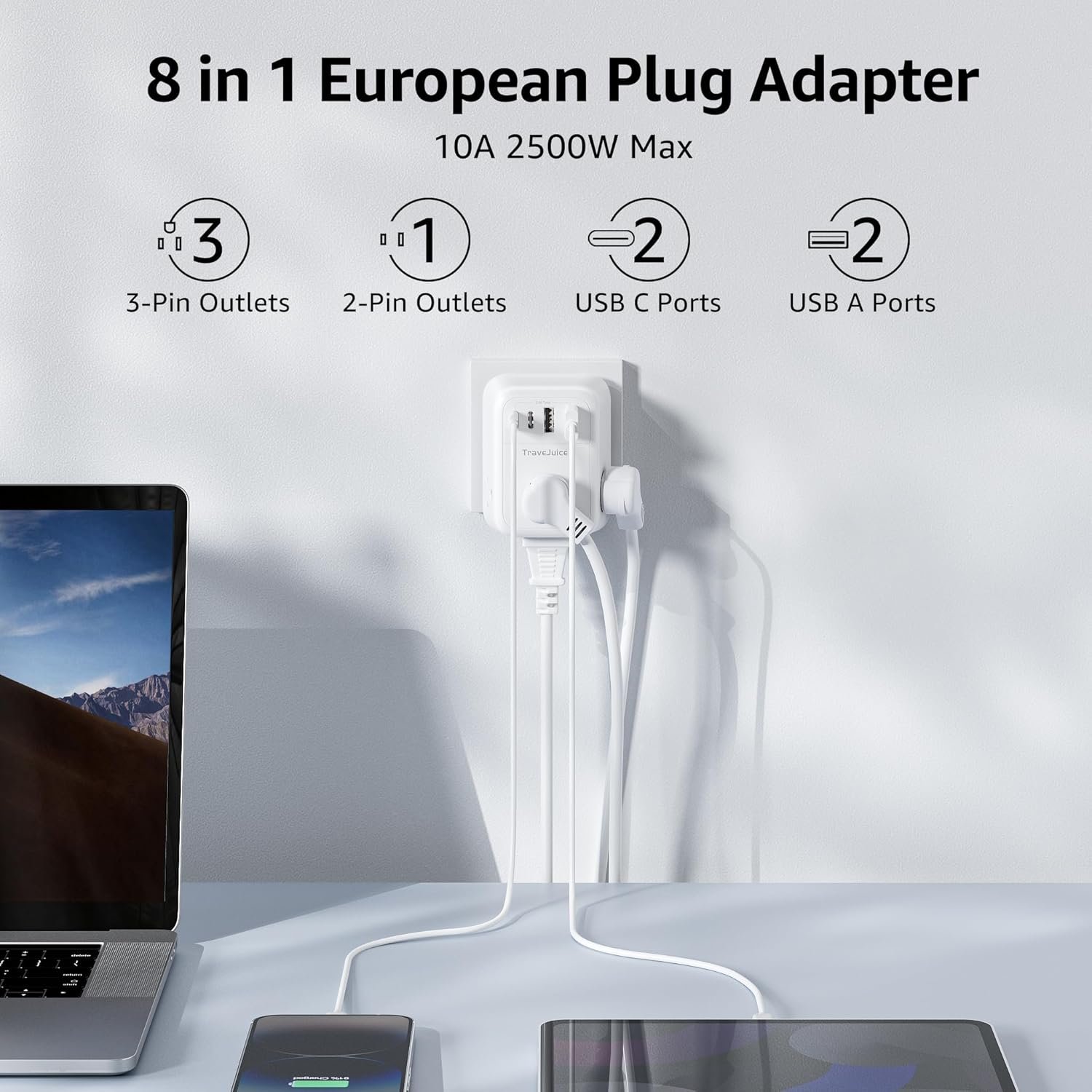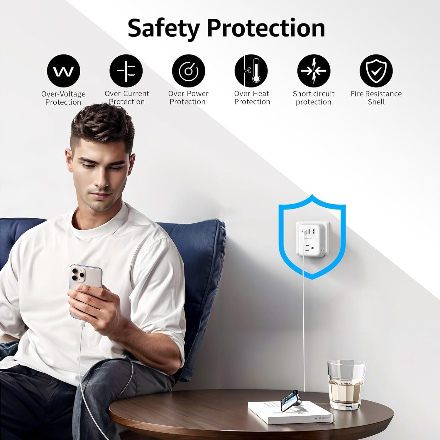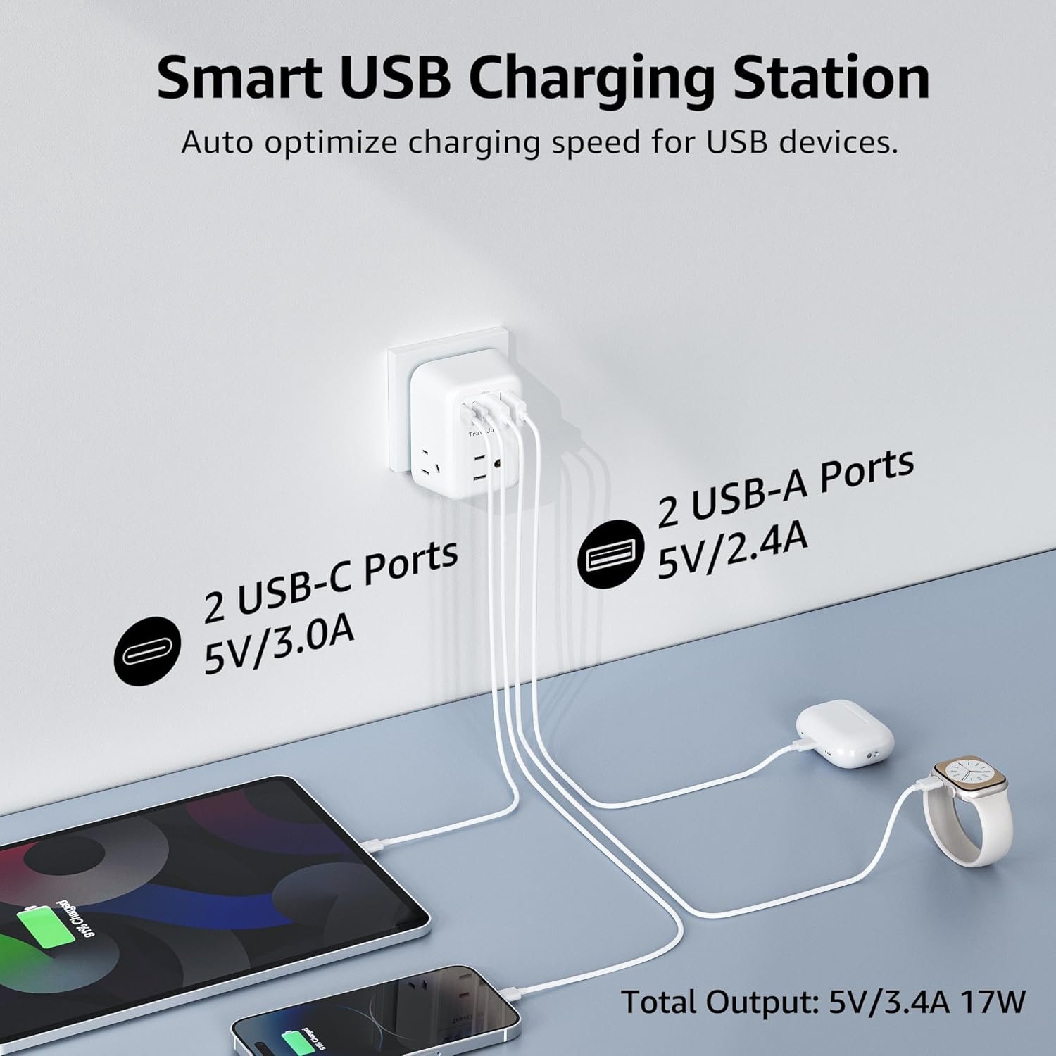 [8 in 1 Plug Adapter] – 2 USB C ports can charge up to 3.0A/15W, 2 USB A ports can charge up to 2.4A/12W, and all USB ports can output 3.4A max. With our type C power outlet charger, you can charge your USB devices, including iPhones, kindles, wireless earphones, laptops, razors, etc. However, we do not recommend using it on high-power appliances, such as hair dryers and straighteners.