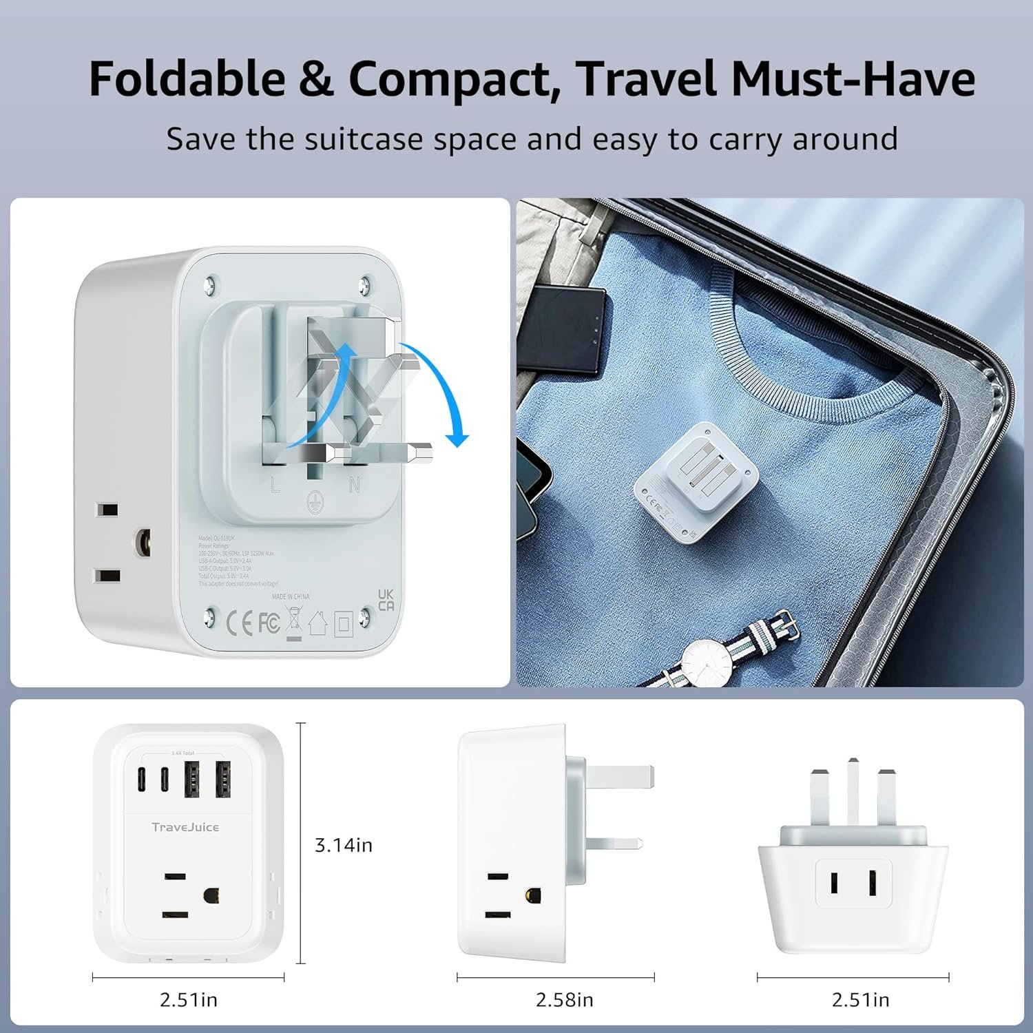 US to UK Plug Adapter, TraveJuice Type G Travel Adaptor Foldable with 4 USB Charger(2 USB C), 4 Outlets UK Power Adaptor for USA to Qatar Ireland Hong Kong England Scotland Kenya Dubai London British