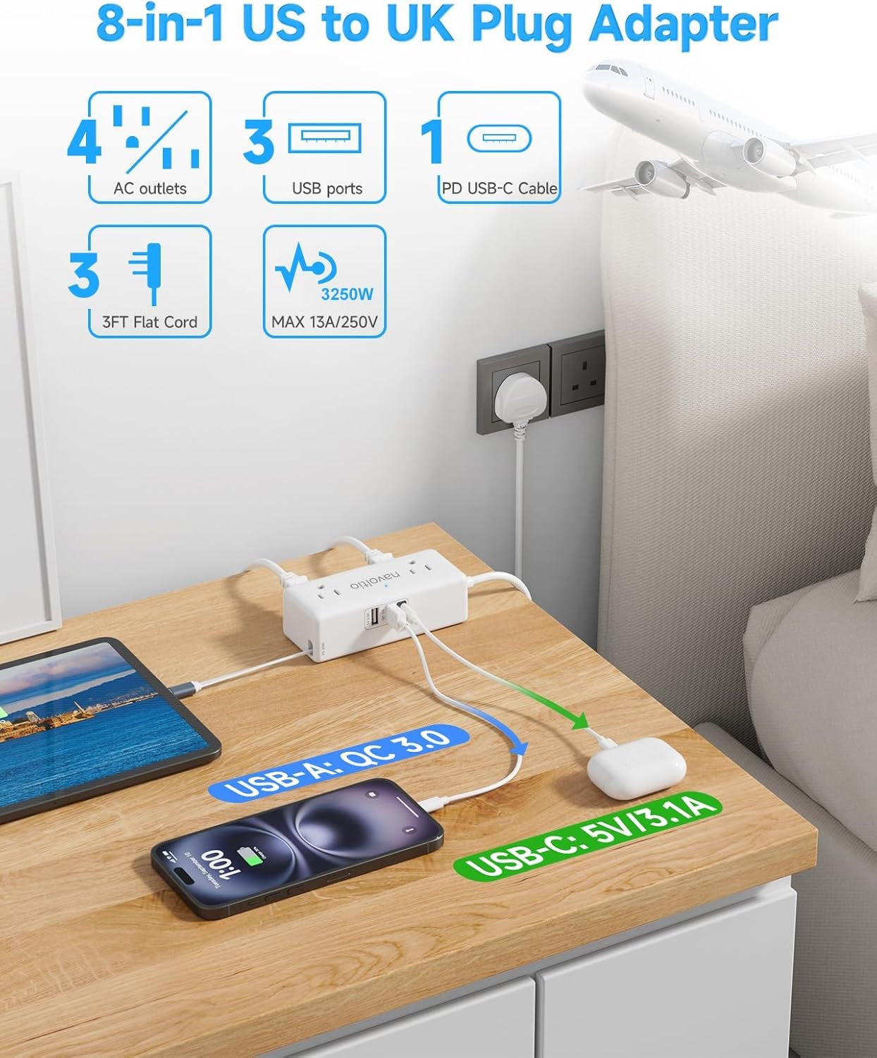 [8-in-1 UK Adapters for Travel] This type G adapter turns 1 outlet into 4 US outlets, 3 USB ports and 1 PD USB-C cable, allowing you charge 8 devices simultaneously, max capacity up to 3250 W(max 250 V, 13 A)