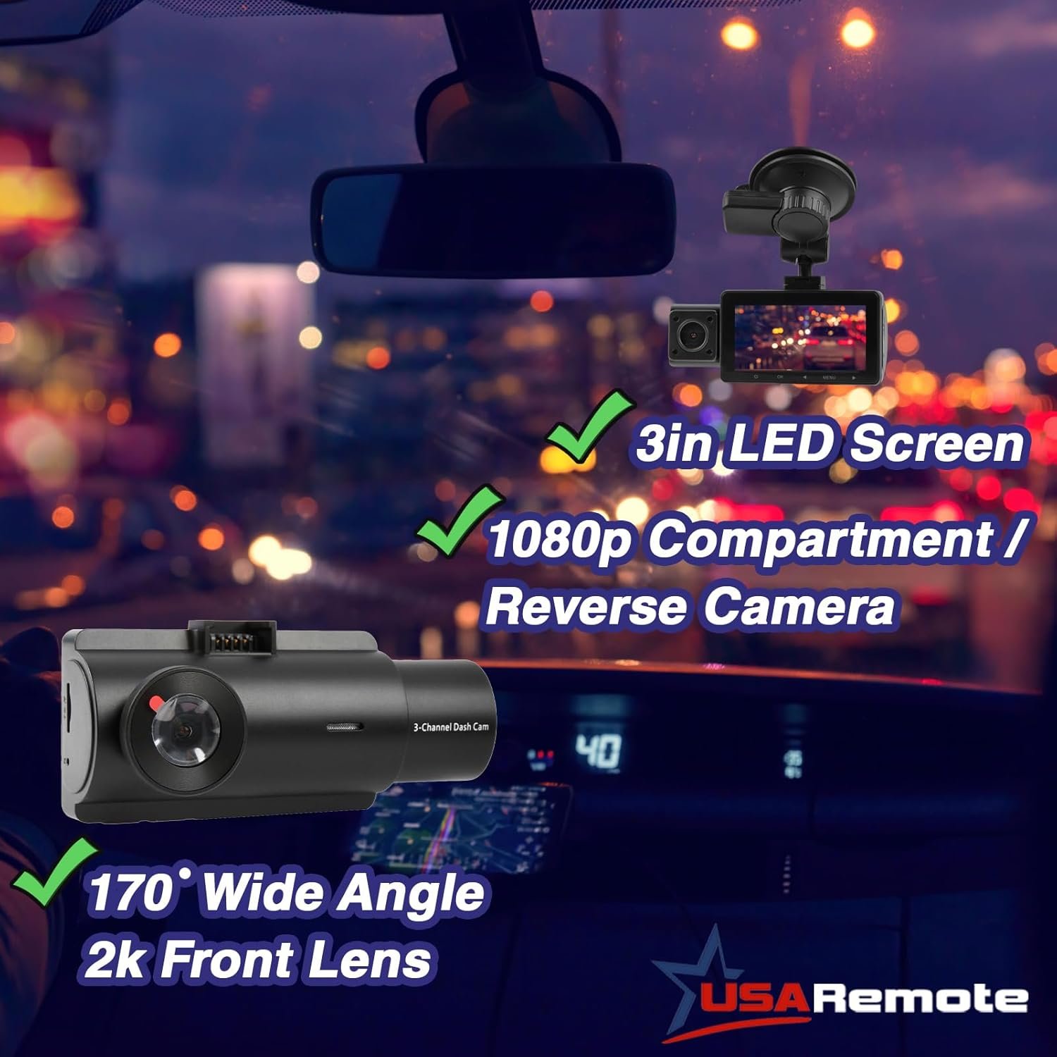 {Quality} USARemote Dashcam has a 3.0 LCD Screen that displays up to 12 different interfaces and uses a super capacitor for a safer and lighter energy source. The front cam records 2K with a 170° wide angle lens, compartment cam and reverse cam records 1080p