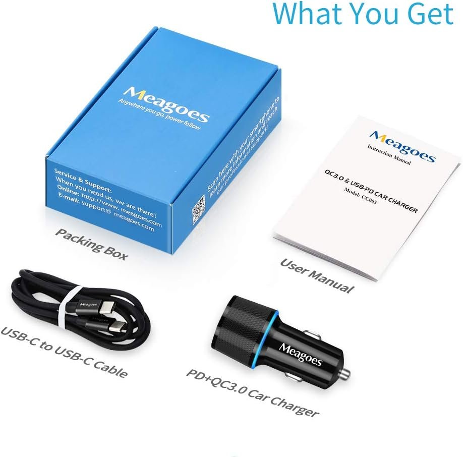 What You Get: The package includes 1x Type C car charger, 1 x 3.3 ft USB-C to C cable