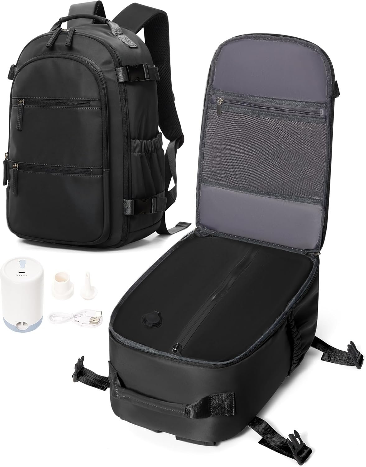 vacuum backpack travel,Travel Airback Backpack,Carry on Backpack with Air Pump,Vacuum Seal Compression Backpacks, Personal Item Travel Bag 17x10x9 Airlines Approved,Black