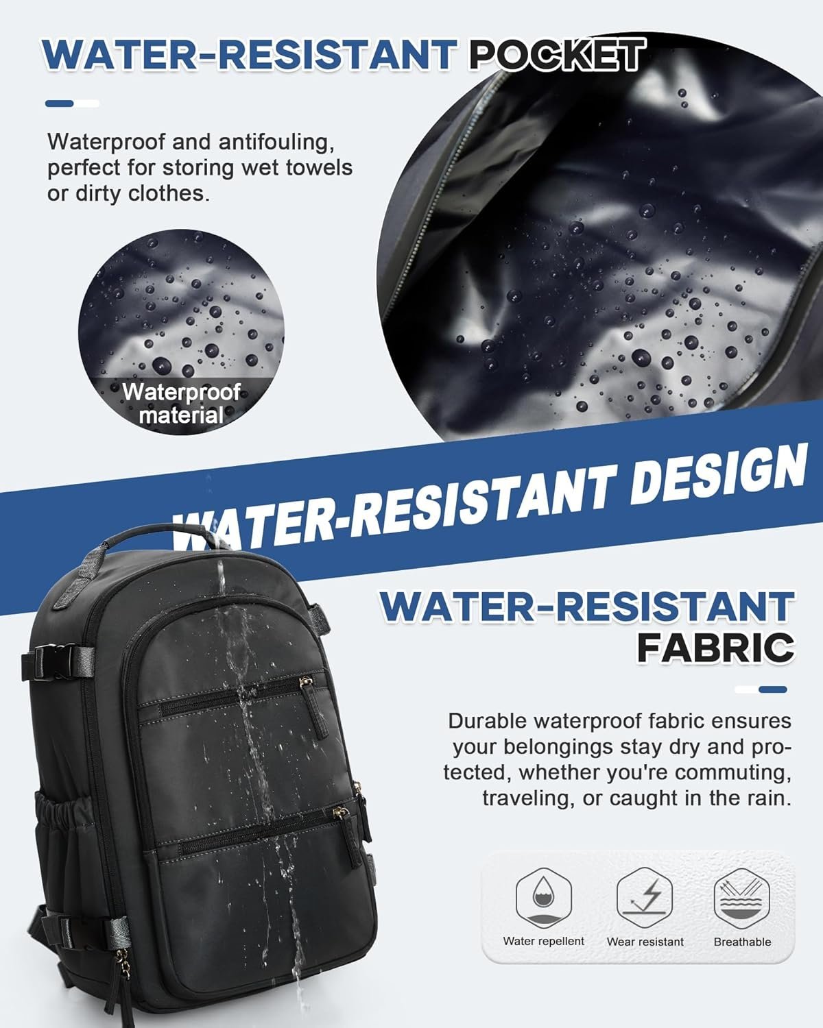 【Multiple Compartments】features three spacious main compartments and multiple hidden pockets, a dedicated dry/wet separation pocket to separate wet and dry items, isolating damp clothes and odors, can hold a 14-inch laptop