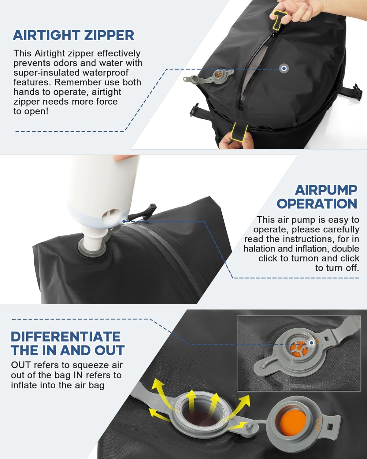 【Vacuum Seal Backpack 】Still confused in saving clothes storage? Don’t worry, with vacuum seal compartment and a one-way outlet valve, you can opt for manually press to release air or vacuum pump for quicker compression. The main zipper is designed to be airtight, will need more strength to pull and are strongly recommend by using both hands to operate, won’t break don’t worry.