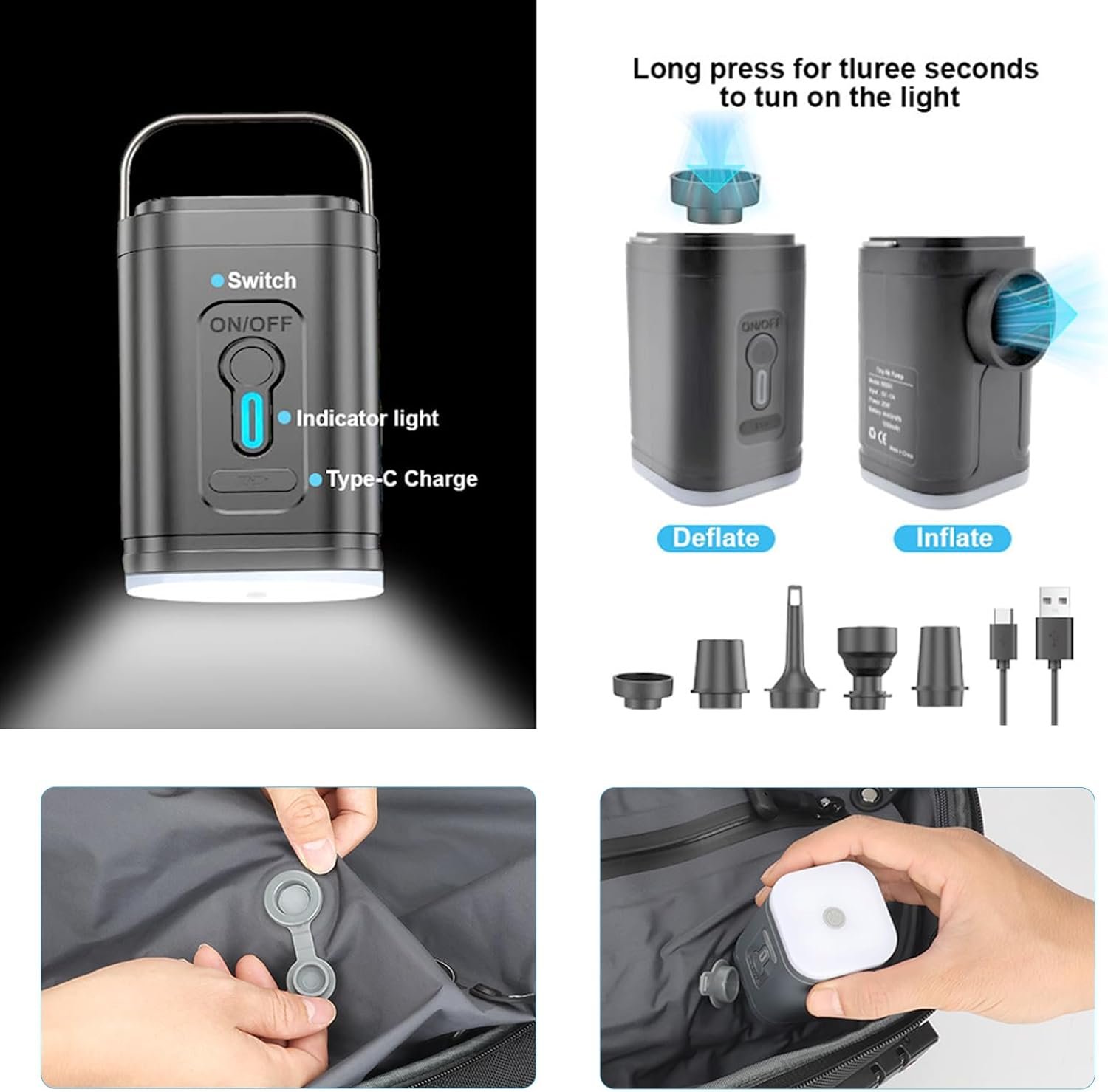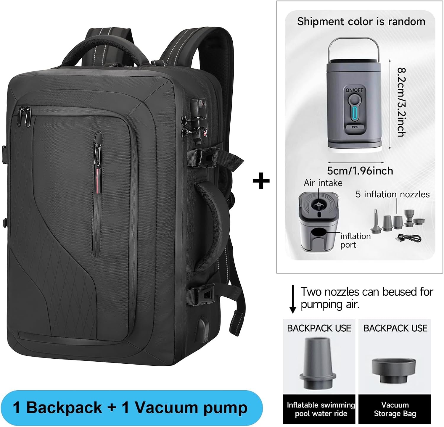 【Vacuum Pump and Anti-theft Lock】The vacuum pump has different nozzles that can be used in different scenarios. It also has a light that can provide you with lighting when traveling at night. In order to make your travel safer, the Vacuum backpack adopts TSA customs anti-theft design. You can better protect the items inside your back pack vacuum and reduce the possibility of loss. The password operation setting of the TSA customs combination lock is very simple.