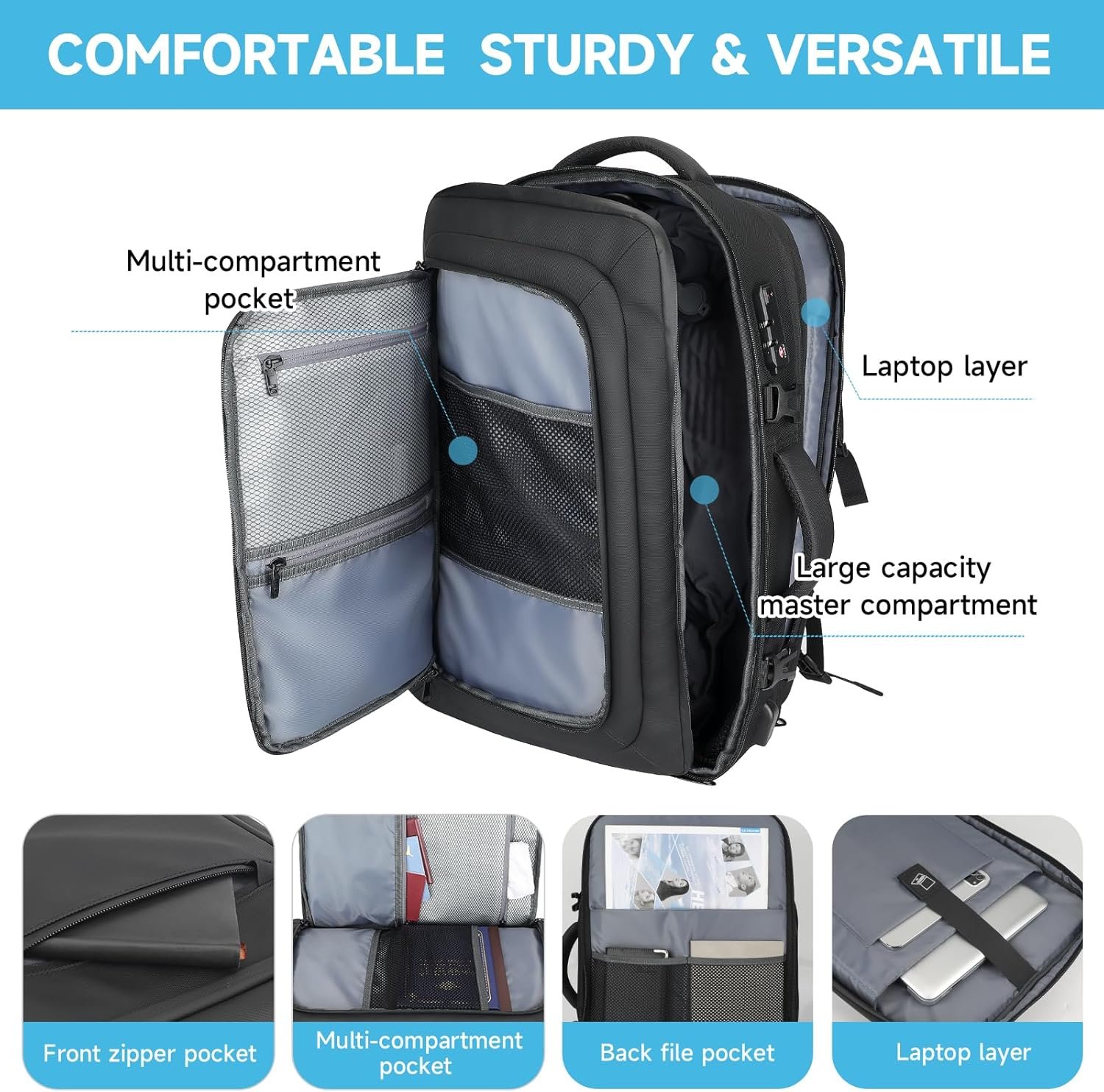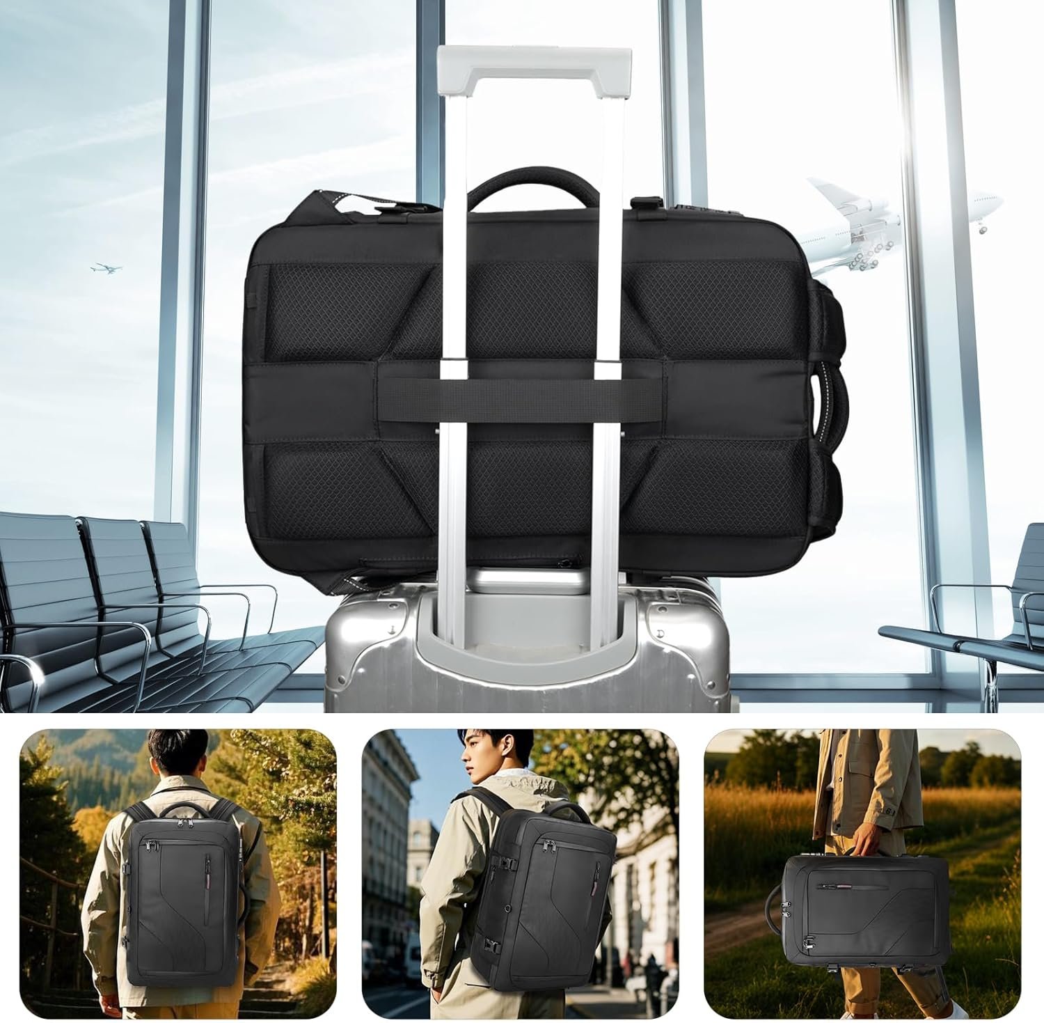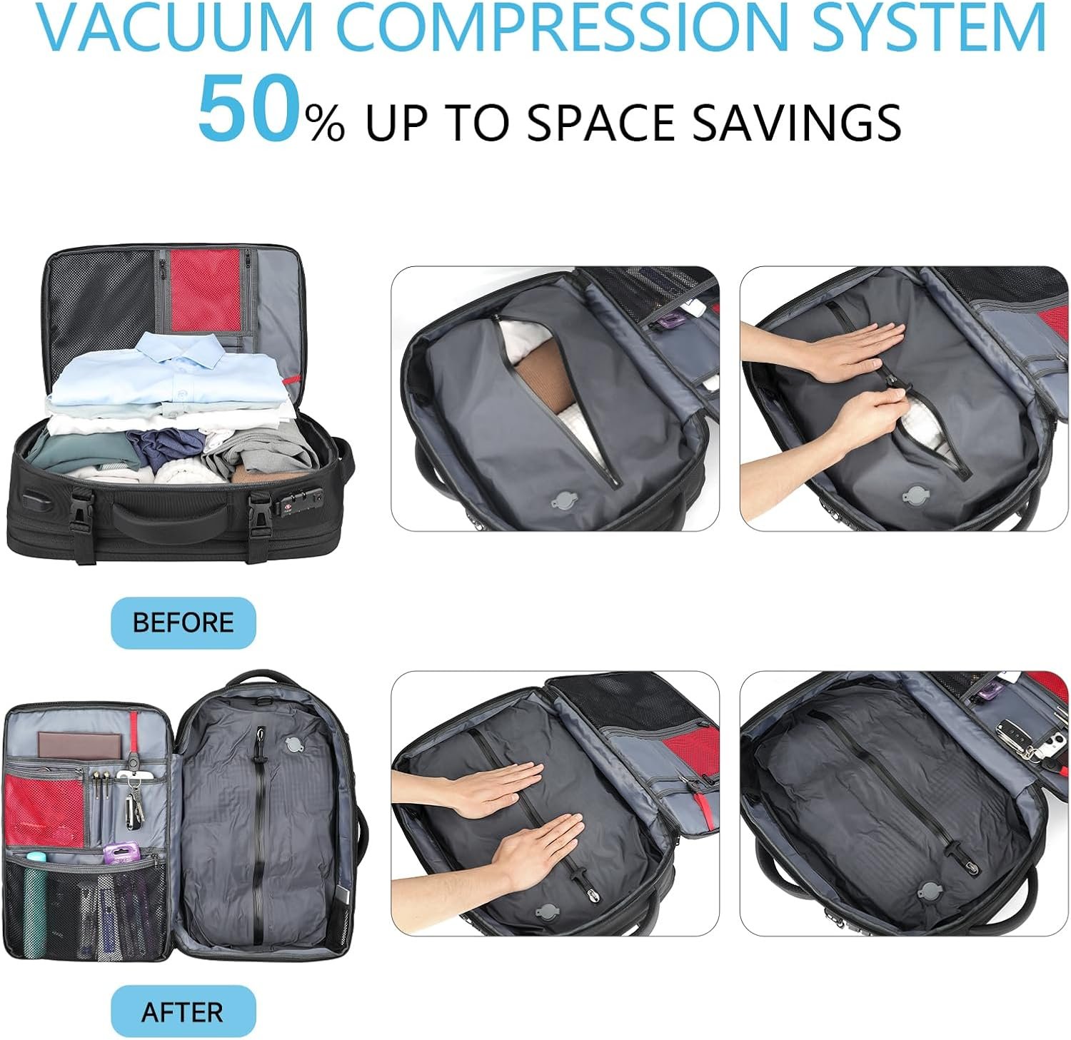 【Comfortable, Sturdy & Multi-Purpose】The air vacuum backpack features a multi-panel airflow design with a 3D back pad, breathable and adjustable shoulder straps, and a waist belt lining to reduce shoulder and back strain. The handle provides flexible carrying options, and the vacuum travel backpack includes a trolley strap to secure it to your suitcase, making your travel experience more convenient.