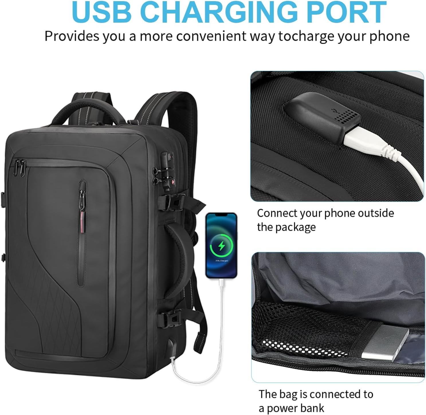 The laptop backpack has a built-in USB cable. You can connect the USB to your portable charger. The other end of the USB cable connects to a port on the outside of the backpack, where you can plug in your devices.