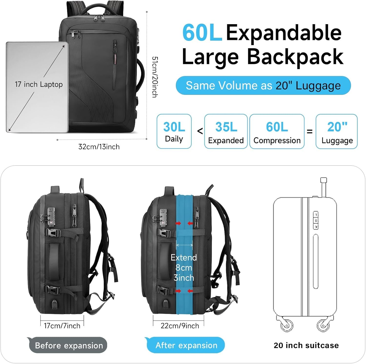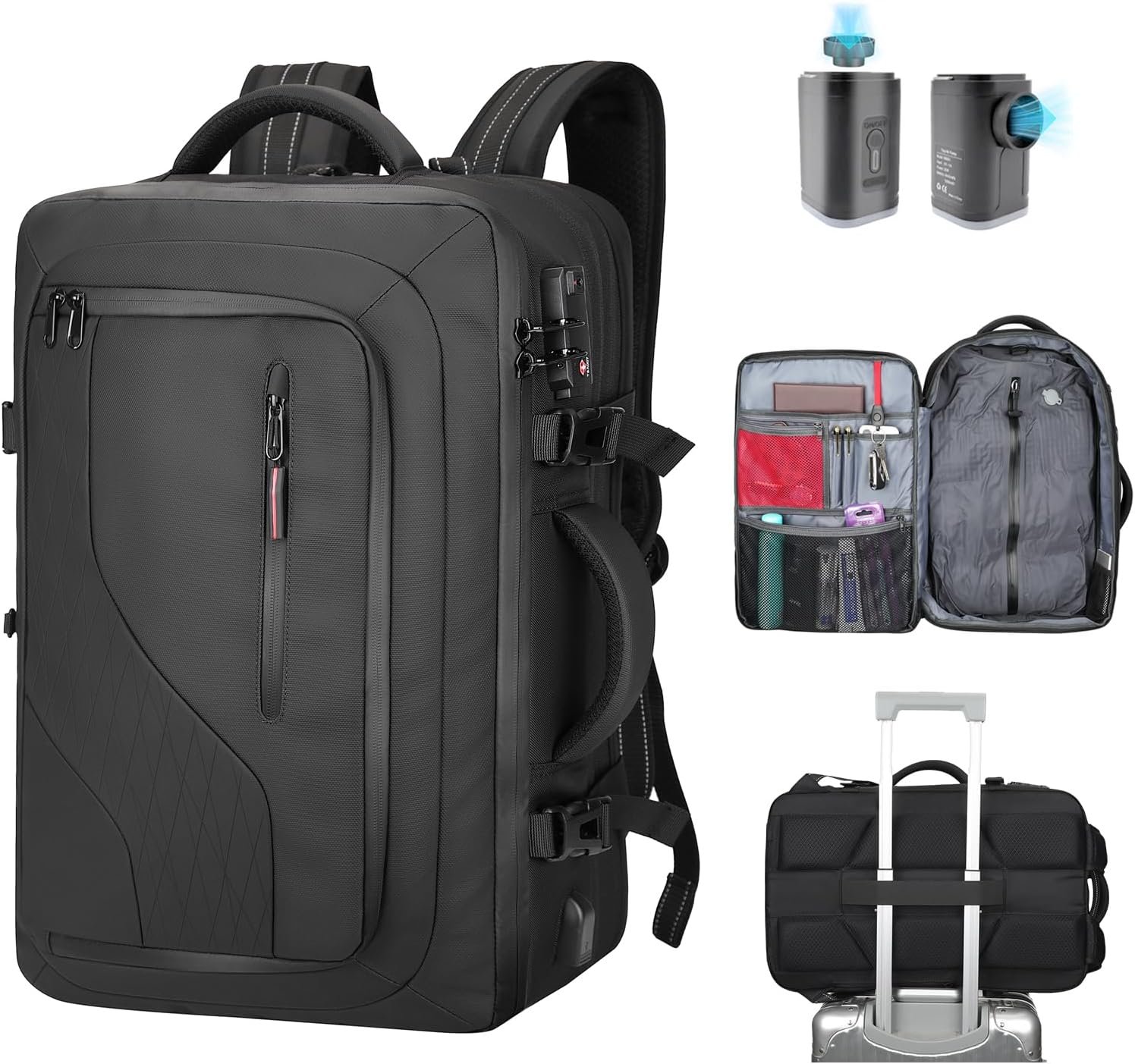 【Vacuum Backpack for Travel Space Saving】The airback backpack Vacuum compression,When compressed, its capacity expands to 60L,comparable to a 20-inch suitcase, yet it measures just 20 x 13 x 9 inches. you can choose our electric vacuum pump for rapid compression, optimizing space so you can carry more.