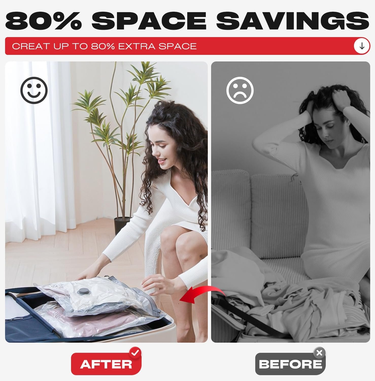 Save Up to 80% of Space: Our vacuum seal bags are designed to help neatly organize and save space in your suitcase when travlling, store and protect your clothes for a long time, and able to pack more luggage when you travel