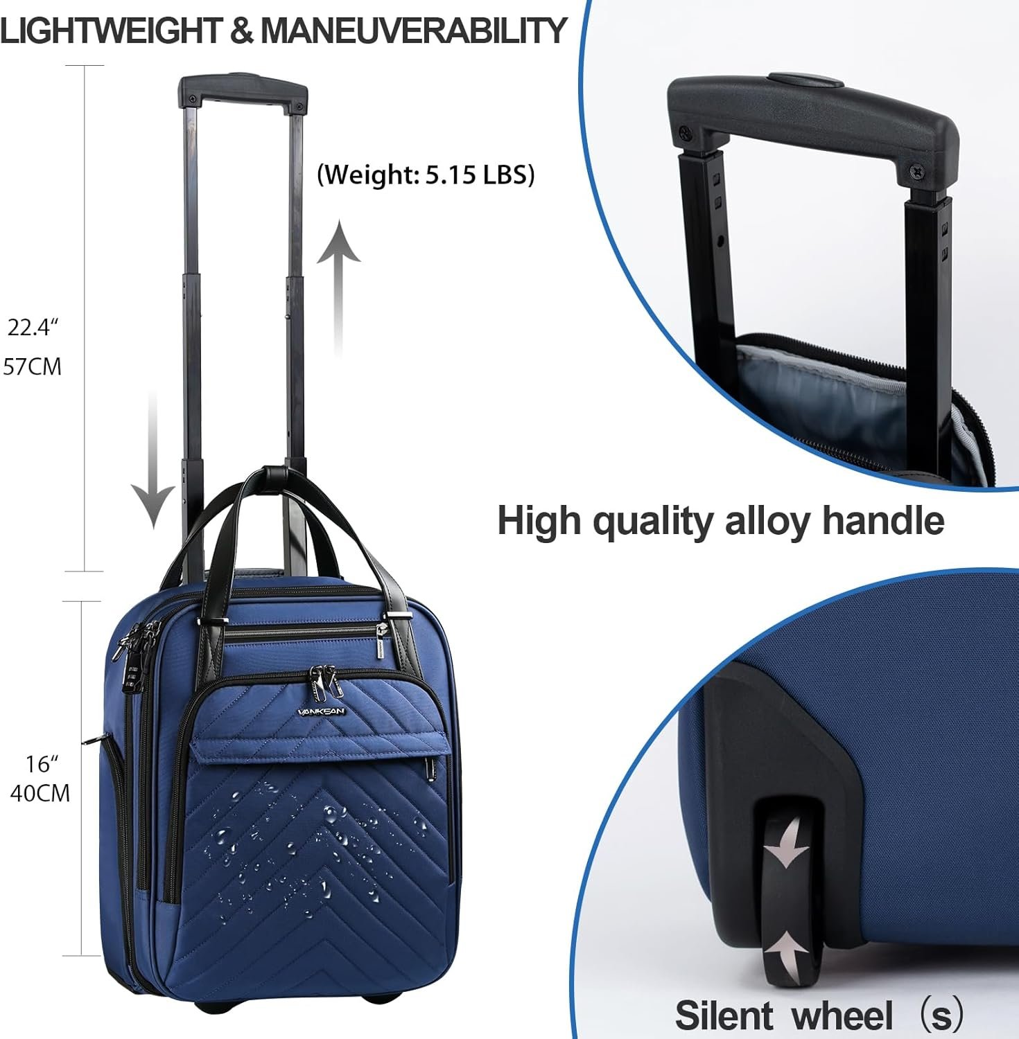 VANKEAN Carry On Underseat 16-inch Multi-functional Underseater Lightweight Overnight Suitcase with Wheels, Roller Case for Men Women Travel Business, Blue